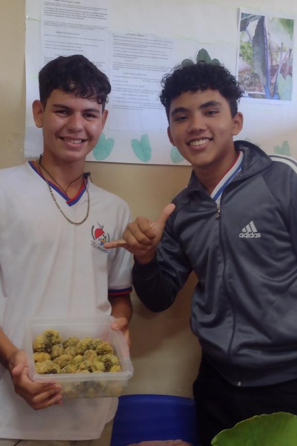 “Eu achei a feira extremamente interessante, estou conhecendo coisas que eu nunca imaginei conhecer. A minha sala fala sobre as PANCs - plantas alimentícias não convencionais - e o meu grupo pesquisou sobre a taioba, que é uma planta da América Tropical, pouco consumida e pouco conhecida também, mas que tem inúmeras qualidades, ela tem seu modo de preparo específico e pode ser usada em várias receitas”, explica o estudante da 2ª série do Ensino Médio, Pietro Fernando. Ele e seus colegas proporcionaram aos visitantes a experiência de degustação de um petisco feito de taioba.