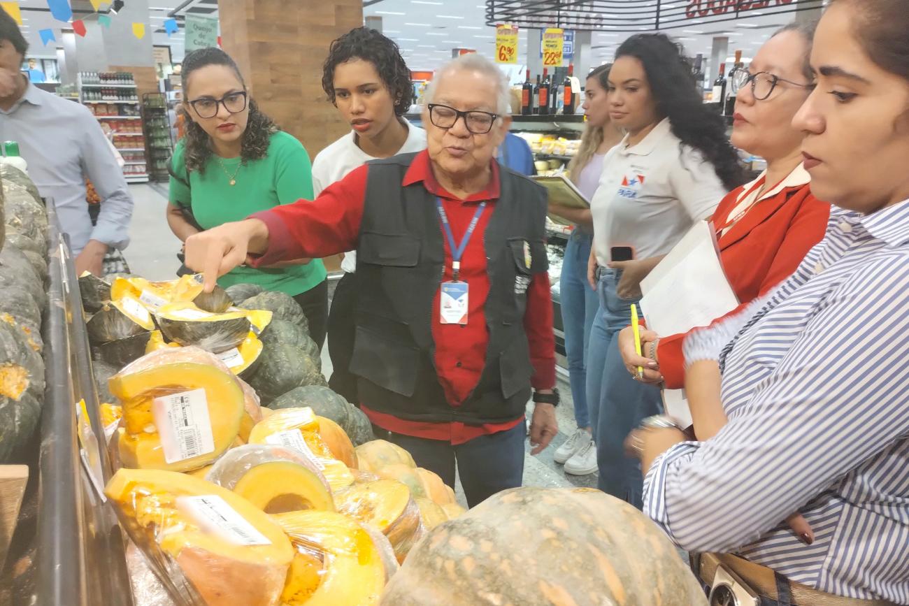 Santino Faro (centro), fiscal do Procon, orienta servidores durante atividadeSegundo Santino Faro, agente fiscal do Procon Pará, o exercício teve como propósito complementar a parte teórica abordada anteriormente no encontro. "É mais uma atividade de orientação do que uma fiscalização propriamente dita. Capacitamos os participantes para analisar diferentes setores da alimentação, como hortifruti e pescados, e também a parte de medicamentos e eletrodomésticos, sempre zelando pelos direitos do consumidor. Além disso, realizamos testes de qualidade e quantidade de produtos no posto de combustível", explicou.
