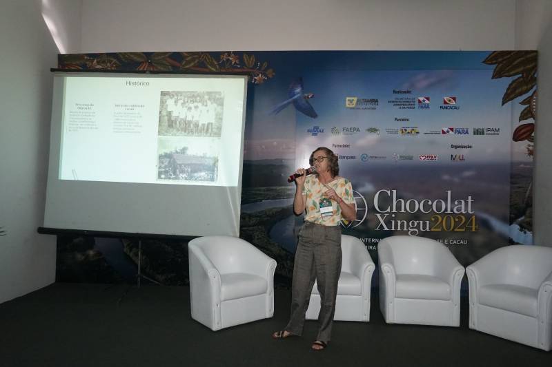 A produtora participou do Fórum da Cacauicultura da Transamazônica e do Xingu, realizado em conjunto pelas Secretarias de Estado de Desenvolvimento Agropecuário e da Pesca (Sedap) e de Agricultura Familiar (Seaf), no Centro de Eventos em Altamira. Jiovana Lunelli abordou o tema “Cacau Xingu: da árvore à barra de chocolate em sistema agroflorestal sustentável”.Pará é o maior produtor nacional de cacau