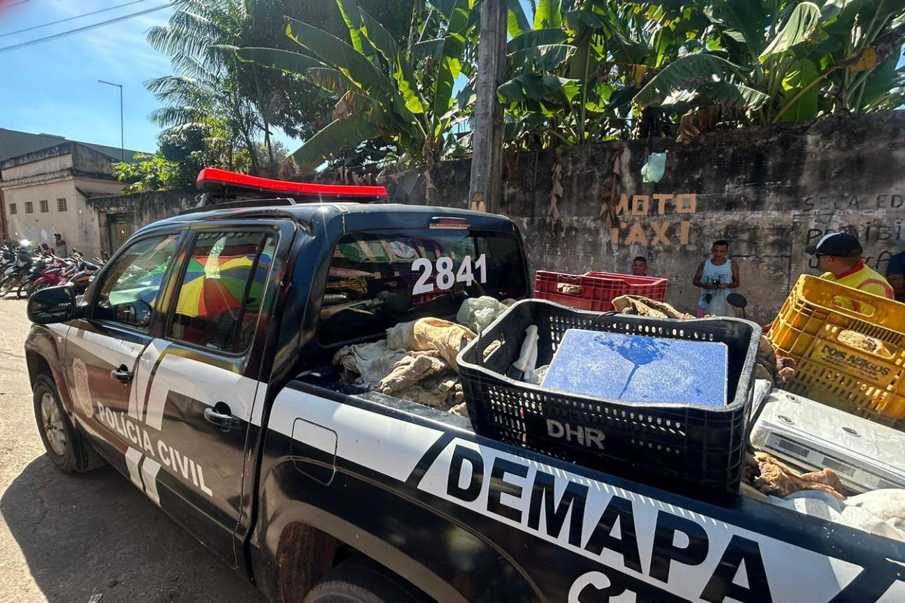Cerca de cinco toneladas de carnes de animais silvestres que estavam sendo comercializadas de forma ilegal em uma feira em Abaetetuba, foram apreendidas, na terça-feira (18), pela Divisão Especializada em Meio Ambiente e Proteção Animal (Demapa), da Polícia Civil. Dois homens foram presos em flagrante.