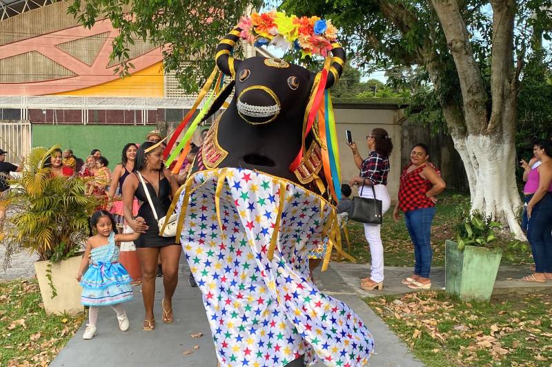 O grupo Arraial do Pavulagem também esteve presente e comandou o cortejo nos arredores do abrigo, que finalizou com a apresentação do boi.