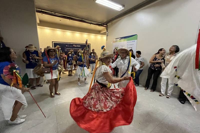 Um misto de cultura e alegria tomou conta dos corredores do Hospital Ophir Loyola (HOL) durante o arrastão promovido pelo Arraial do Pavulagem, nesta quinta-feira (20). O coletivo de artistas, que celebra 36 anos de história, encantou usuários, acompanhantes e servidores com o colorido das fitas e ritmos da cultura popular paraense. A iniciativa, promovida pela equipe de Terapia Ocupacional da unidade hospitalar, despertou memórias afetivas e promoveu bem-estar e senso de comunidade para as pessoas hospitalizadas.