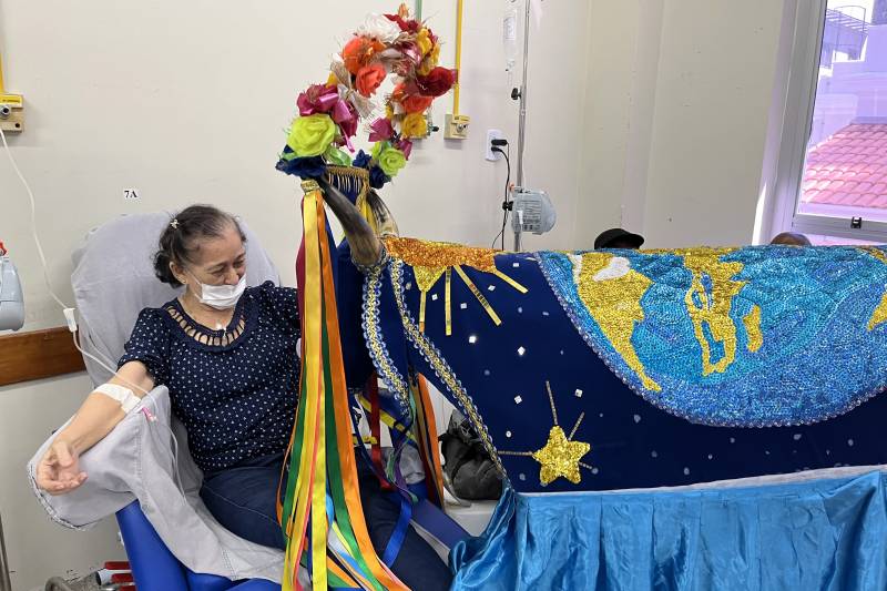 Moradora do bairro de Canudos, Maria Rita da Silva, 68 anos, faz tratamento desde o ano de 2020 contra o câncer de mama. Embora enfrente um recidiva da doença, não se deixa abater. Ela encontra nas ações de humanização do hospital, uma forma de ressignificar o processo de enfrentamento da doença, a vida. Com trajes a rigor, era uma das brincantes mais animadas do cortejo .“Não é porque aconteceu algo em minha vida que preciso ficar triste, procuro me animar. Isso que estão fazendo aqui é para transformar o coração dos pacientes. Estou aqui para vencer e ir até o final, acordo feliz e a minha vida continua”, disse.