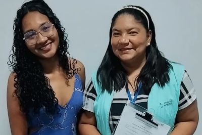 Auxiliar Administrativo do Serviço de Atendimento ao Usuário (SAU) Elita do Nascimento e a usuária Taynara da Silva.A usuária Taynara da Silva, de 22 anos, comenta que sempre aproveita para saborear as clássicas comidas típicas nas tradicionais festas juninas, mas considera o consumo moderado de cada prato.
