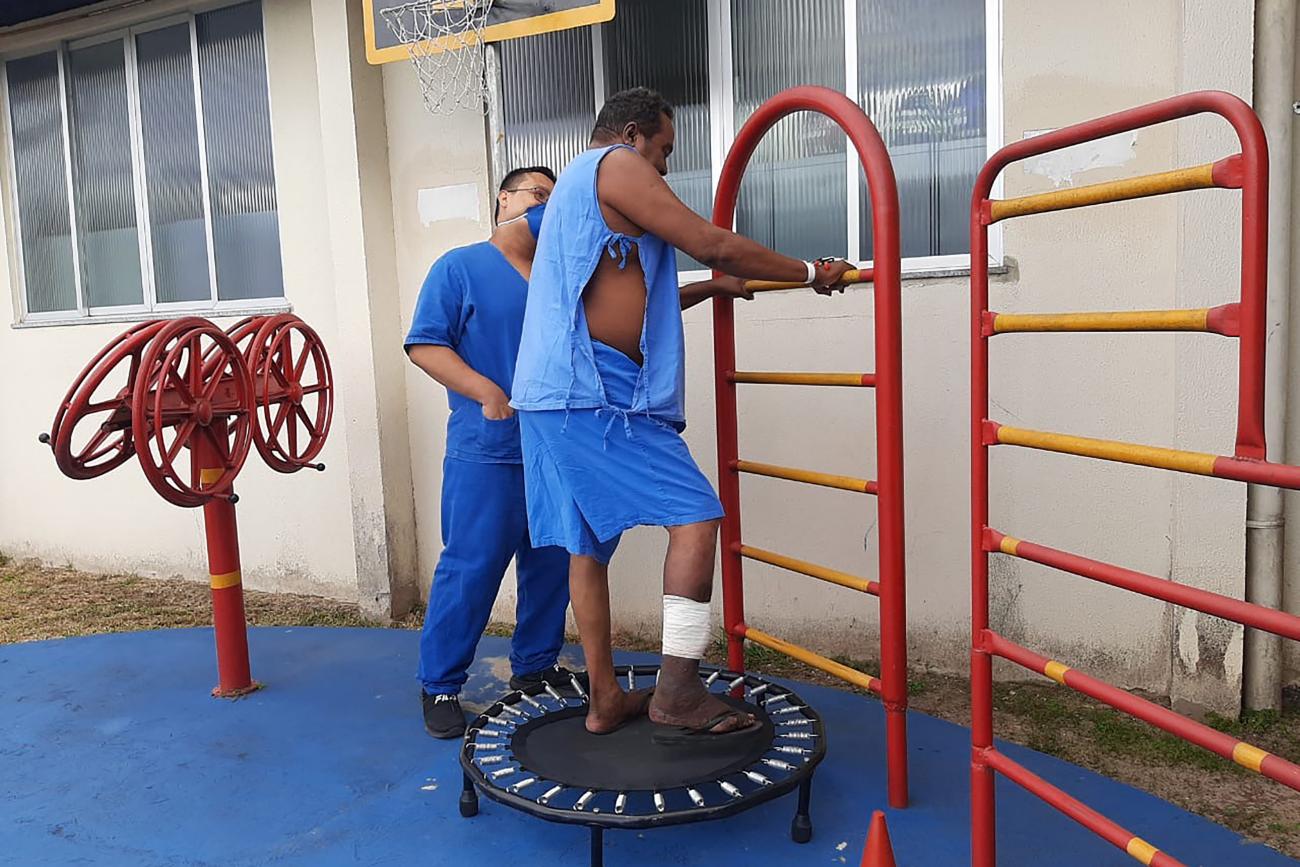 Há 44 dias internado no Galileu, ele vê o espaço como um alívio das suas dores e ansiedade. "É importante essa academia, pois ficamos muito tempo no quarto, e quando estamos nela, há uma interação. O espaço nos ajuda a movimentar melhor e manter as condições físicas", afirma. Na Academia Sustentável, Silvano faz bicicleta, alongamento, exercício na panturrilha e no braço.