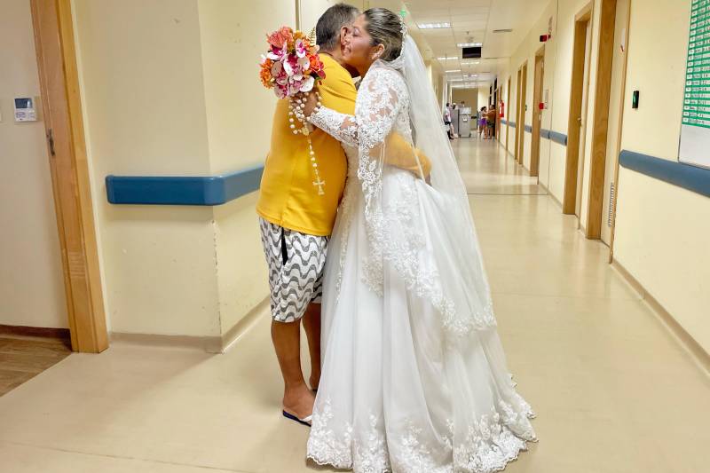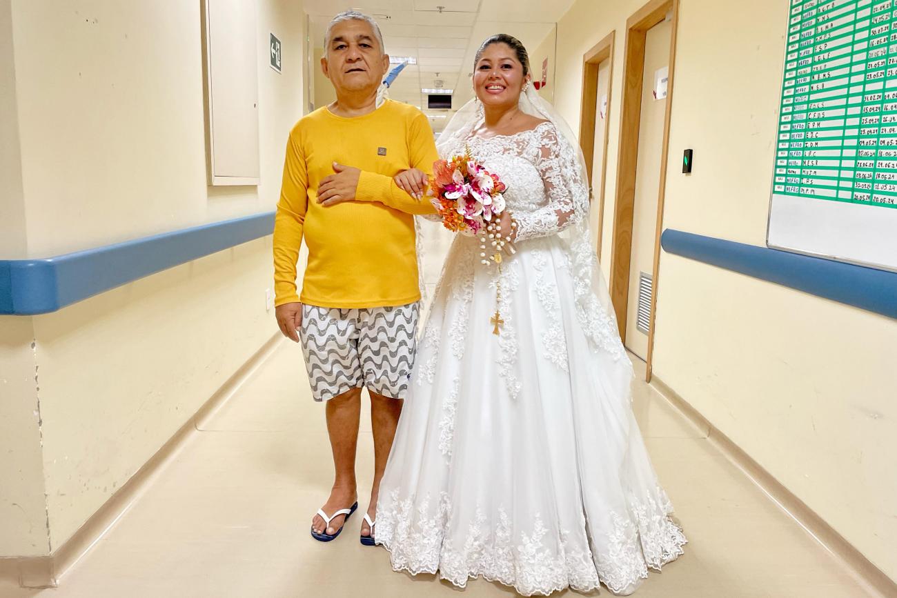 Vestida de noiva, filha surpreende pai internado no Abelardo Santos, após cerimônia de casamento