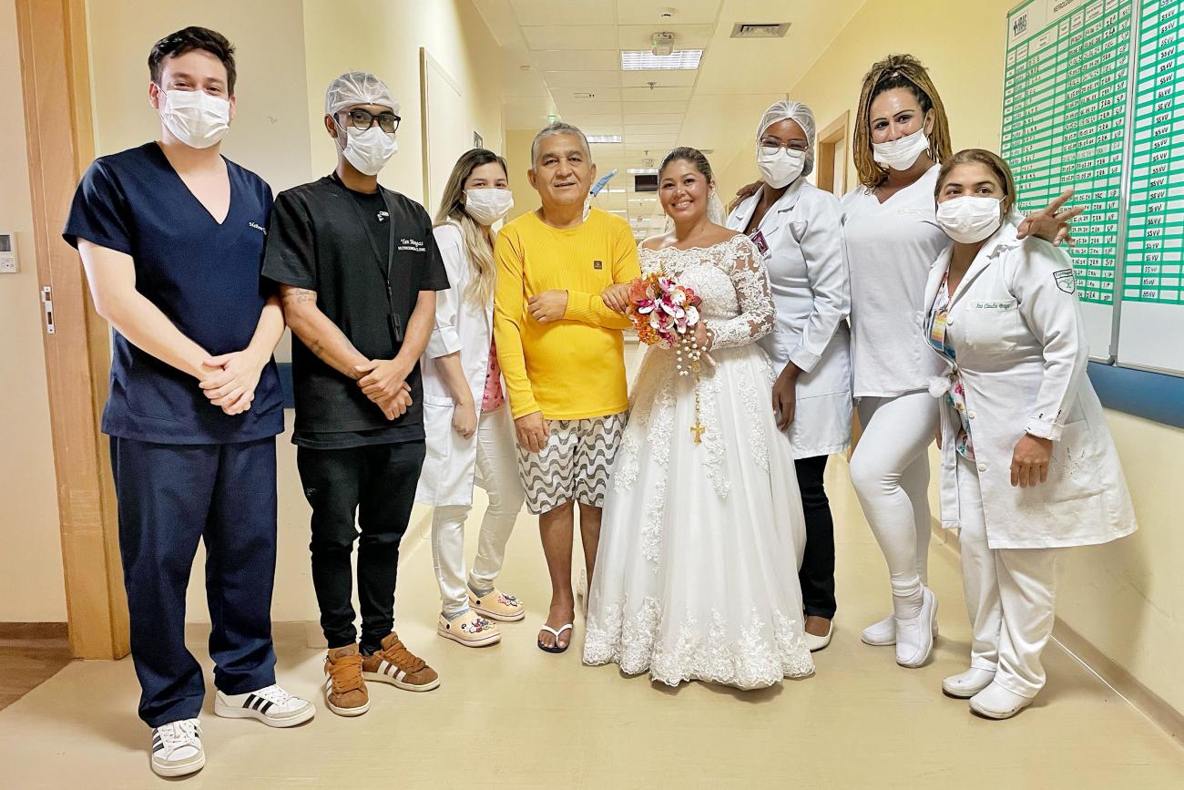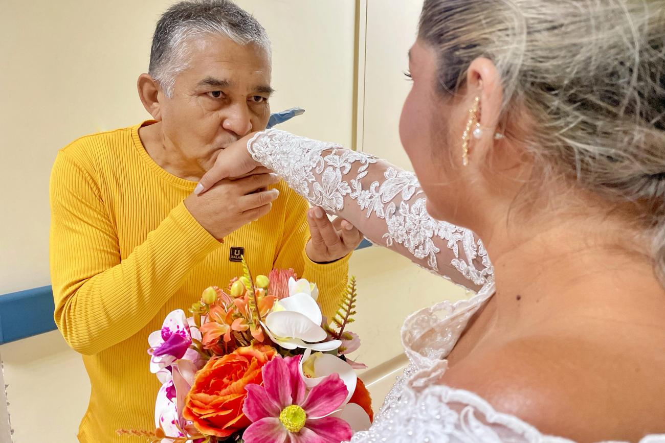 A caminhada da recém-casada até o leito de Augusto foi acompanhada pelos olhares atentos da equipe multidisciplinar e dos pacientes. “Somos uma família muito unida e tudo que eu queria era que ele tivesse entrado comigo no casamento, mas devido ao tratamento e prezando pela saúde e segurança dele, não foi possível. Então, fiz de tudo para estar aqui e tirarmos algumas fotos, juntos”.