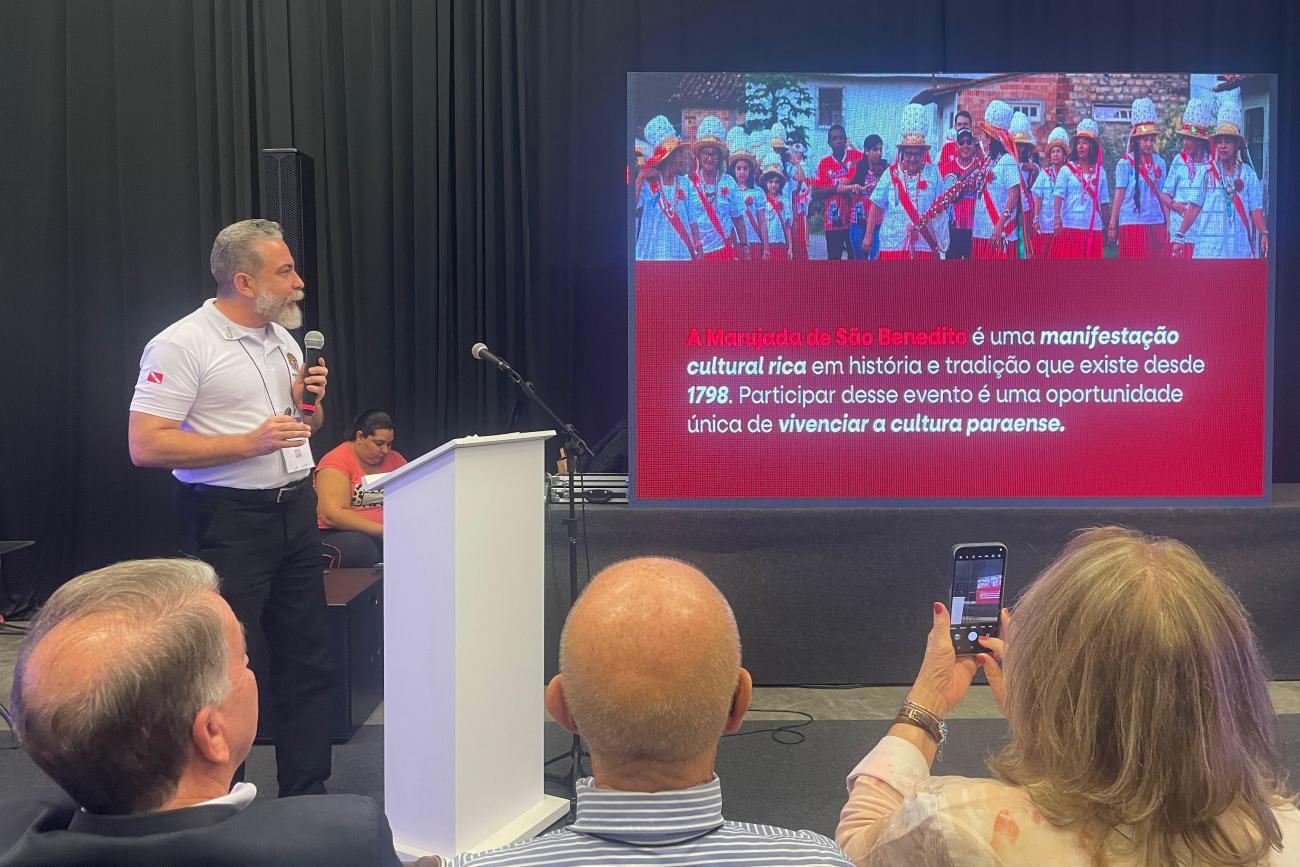 O técnico de Gestão e Planejamento em Turismo da Setur, Carlos Figueira, falou sobre a localização geográfica de Bragança, o acesso ao município e a estrutura de hospedagem, alimentação, atrativos e opções de lazer. E como ponto alto da capacitação apresentou aos empresários do setor o Festival da Marujada de São Benedito.