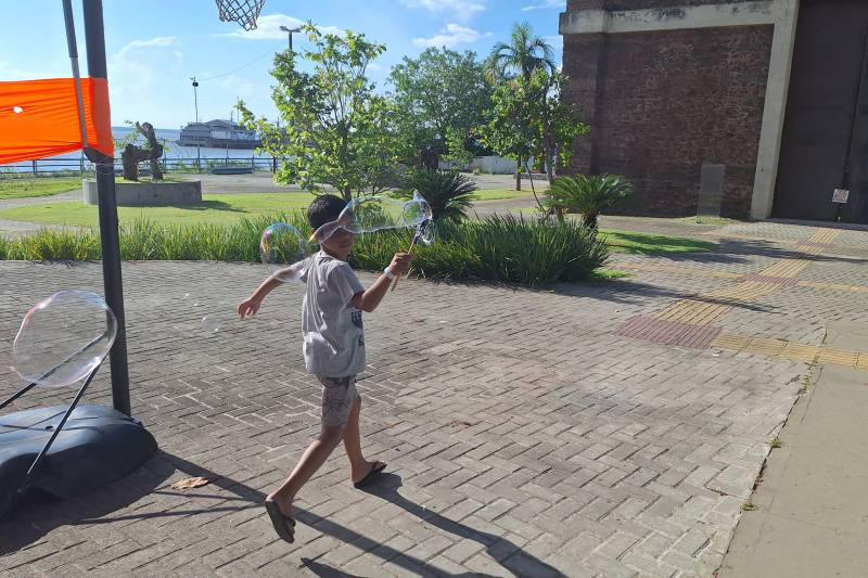 Conduzido pela professora de Teatro do CIIR, Paula Barros, os jogos teatrais são desenvolvidos nas aulas da Oficina de Teatro, ofertada pelo Setor de Arte e Cultura. “Na colônia são jogos de interação, comunicação e cognição. Trabalhamos com o corpo. Trouxemos voltado mesmo para brincadeira, um pouco diferente quando colocamos em prática a atividade dentro do escopo de nossas aulas diárias na Oficina de Teatro, ao trabalharmos mais efetivamente para a vivência, a experiência com o teatro e para desenvolver habilidades socioemocionais, cognitivas e motoras”, disse a professora. Diversão ao ar livre com bolinhas de sabão