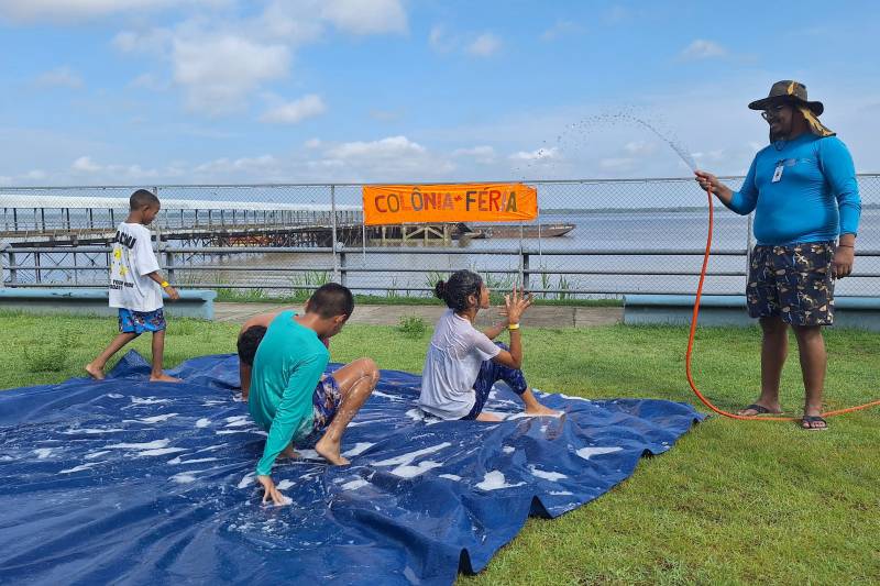 Com o objetivo de promover experiências divertidas e enriquecedoras, que favorecem a prática do acolhimento e promoção de bem-estar, o Setor de Arte e Cultura organizou a programação Inclusiva do CIIR. A cada dia, em dois turnos, os participantes têm diversas opções de lazer em meio aos atendimentos. “As atividades pretendem estimular a criatividade, a experimentação de materiais diferentes, e com isso beneficiar o cognitivo dos participantes”, destacou Denise Morais, supervisora do Setor de Arte e Cultura. Banhos de mangueira aliviam o calor amazônico e garantem interação