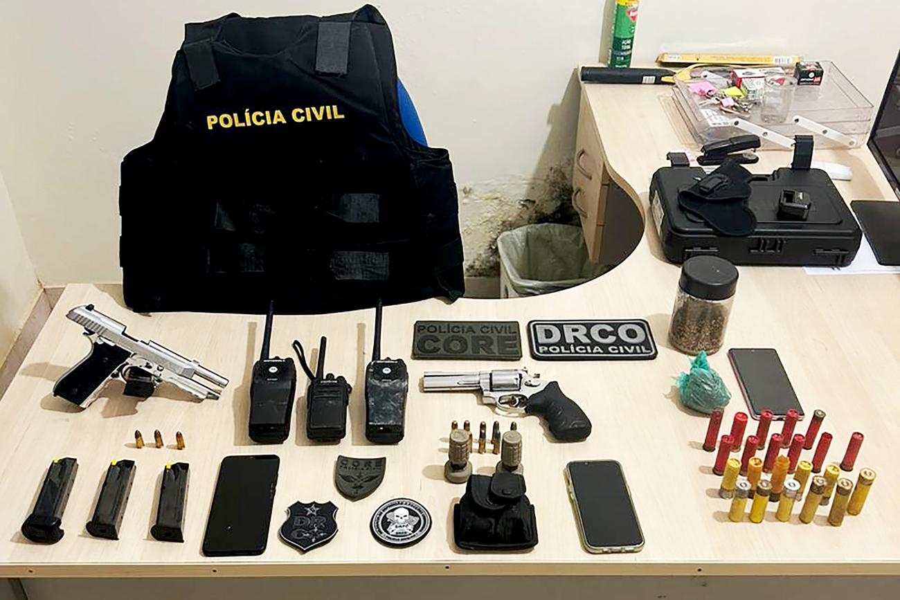 Houve apreensão de armas, rádios HT, munições, um colete da Polícia Civil, drogas e sementes para plantação e cultivo