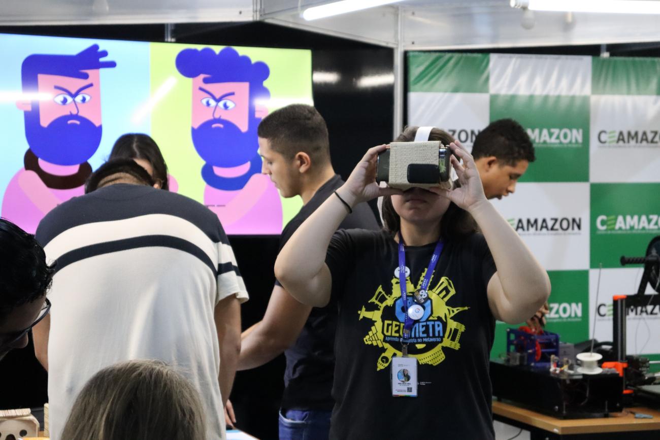 Aplicativos voltados para educação, desenvolvidos pela Inteceleri, startup residente do Parque, atraem o público. O pequeno Henrique Loureiro, de 11 anos, gostou dos óculos Miriti Board, que usa realidade virtual para ensino de geometria. “É muito bacana. É muito mais sustentável. É inovador, pode ajudar muito o meio ambiente”.