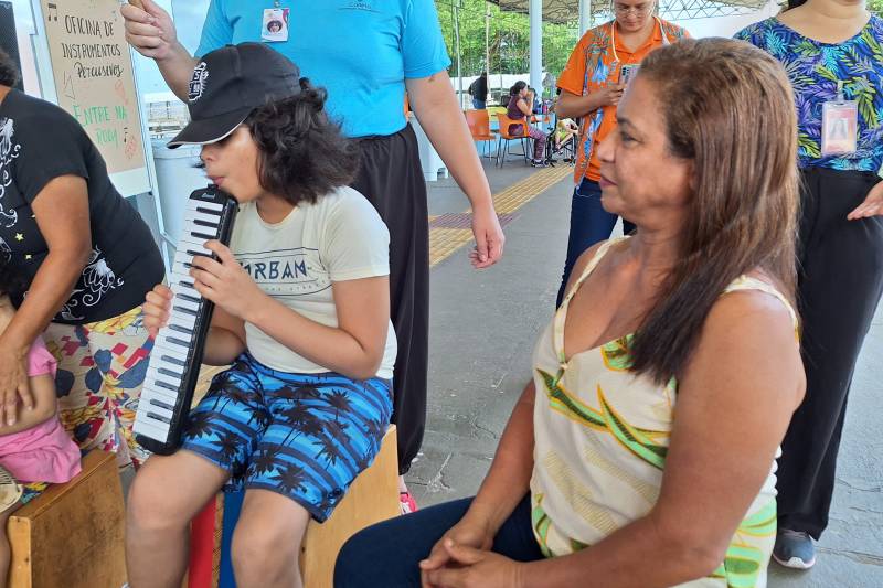 Técnica e ritmo - Nesta sexta-feira, último dia das atividades, o evento contou com a “Oficina de Instrumentos Percussivos”, que fez uma conexão entre usuário, acompanhante e os profissionais, para apresentação de ritmos paraenses. “Trabalhamos percepções rítmicas porque é uma oficina de percussão. Os participantes tiveram experiência tanto no conhecimento de cada nomenclatura dos instrumentos, quanto ao ‘tocar’, e como fazer as partes técnicas e rítmicas”, explicou André Gesiel, professor de Música.