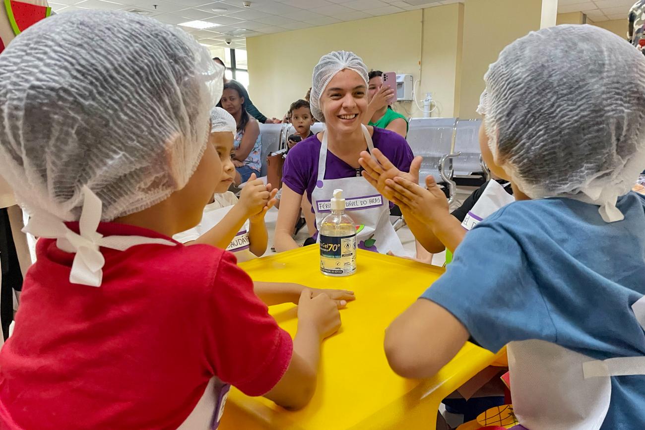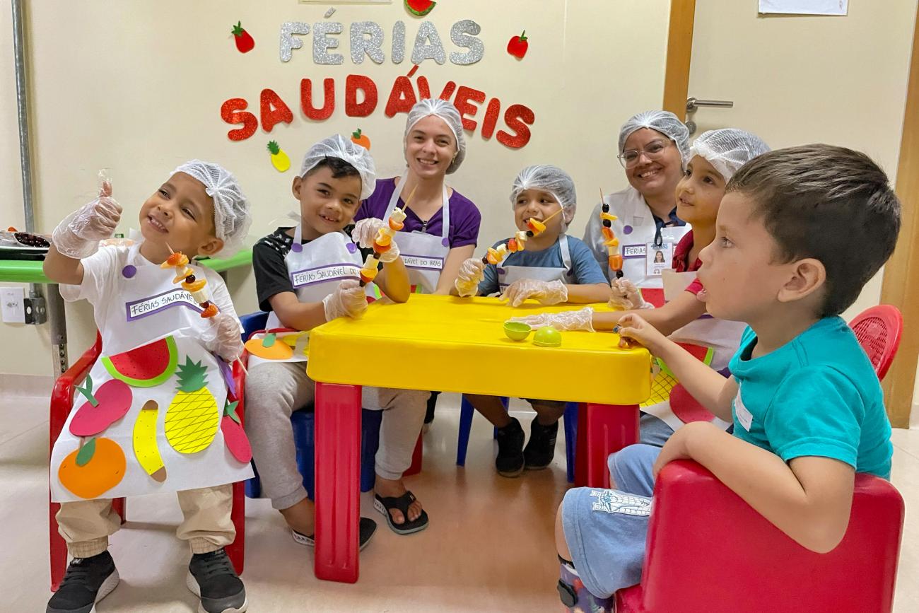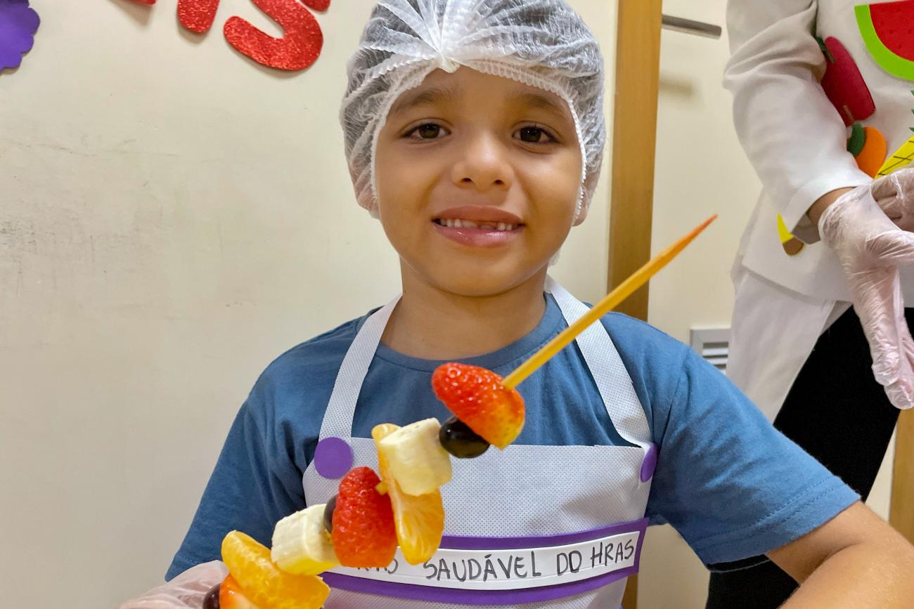 Lanche saudável durante a atividade recreativaDurante a atividade, os nutricionistas do Hospital apresentam os benefícios de cada fruta e convidam as crianças para uma atividade prática de preparação de "espetinho vegetal". “Ele amou, pois gosta muito de frutas”, afirmou Nadiane Costa, mãe de Iago Costa Lima, 7 anos. “Com certeza, vou seguir as orientações e fazer esse tipo de brincadeira com ele em casa, pois desperta a curiosidade”, completou.