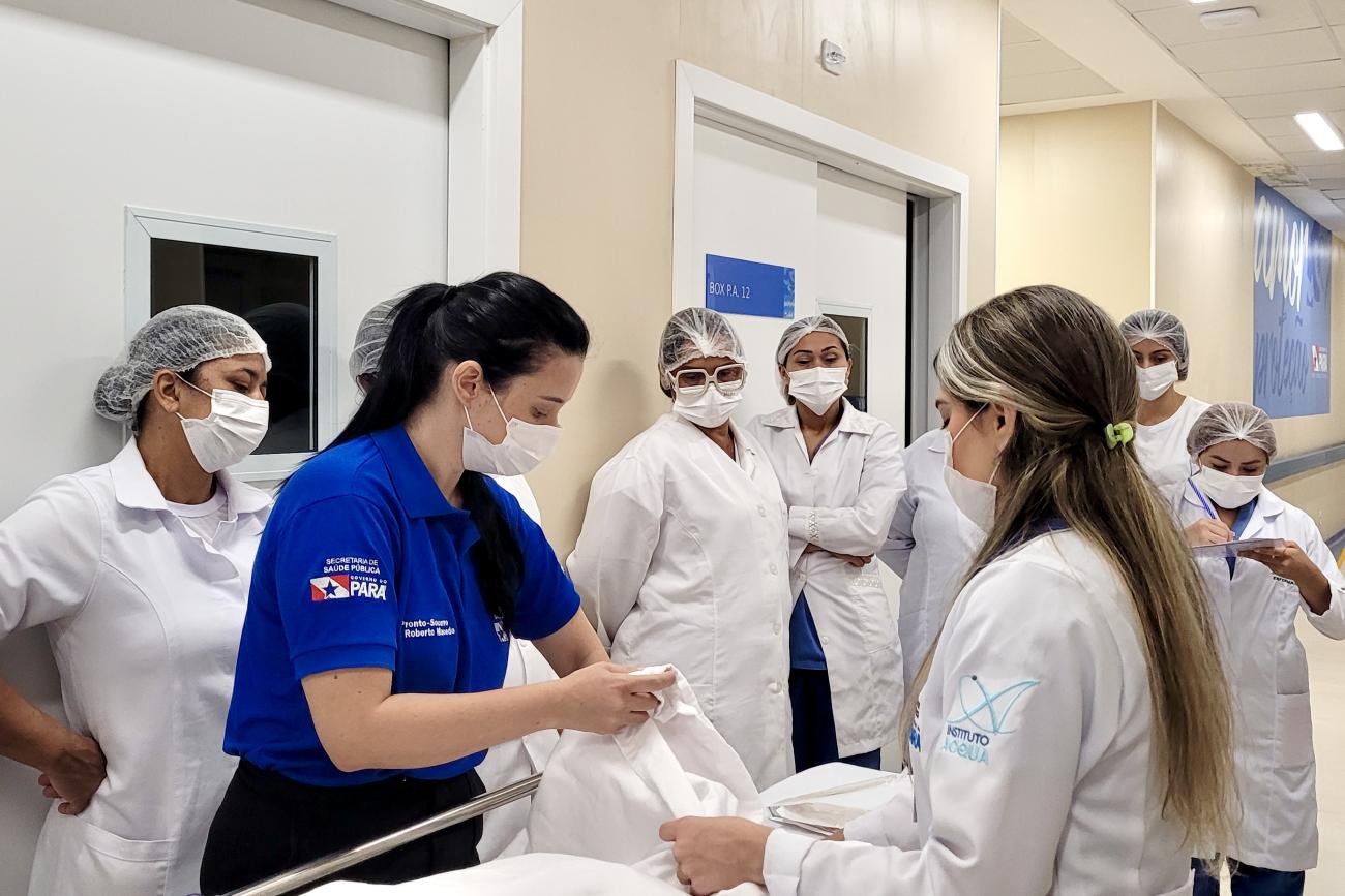 Profissionais em treinamento sobre Aspiração de Vias AéreasProfissionais do Pronto-Socorro Dr. Roberto Macedo (PSRM), em Belém, participam de uma série de treinamentos na área de assistência aos pacientes, iniciada em maio. Conforme a enfermeira do Núcleo de Educação Permanente (NEP), Gilvana Moraes, as capacitações permitem que o trabalho seja feito com mais qualidade, melhorando as práticas assistenciais. Também visam solucionar desafios do trabalho em equipe, com relação à comunicação, normas ou regulações, entre outros, que repercutem positivamente na assistência à saúde dos pacientes.