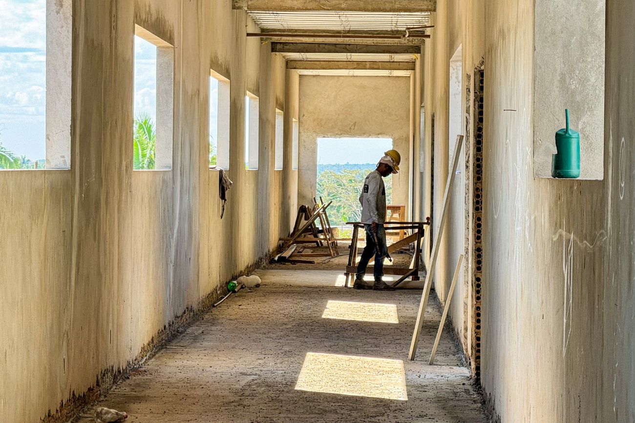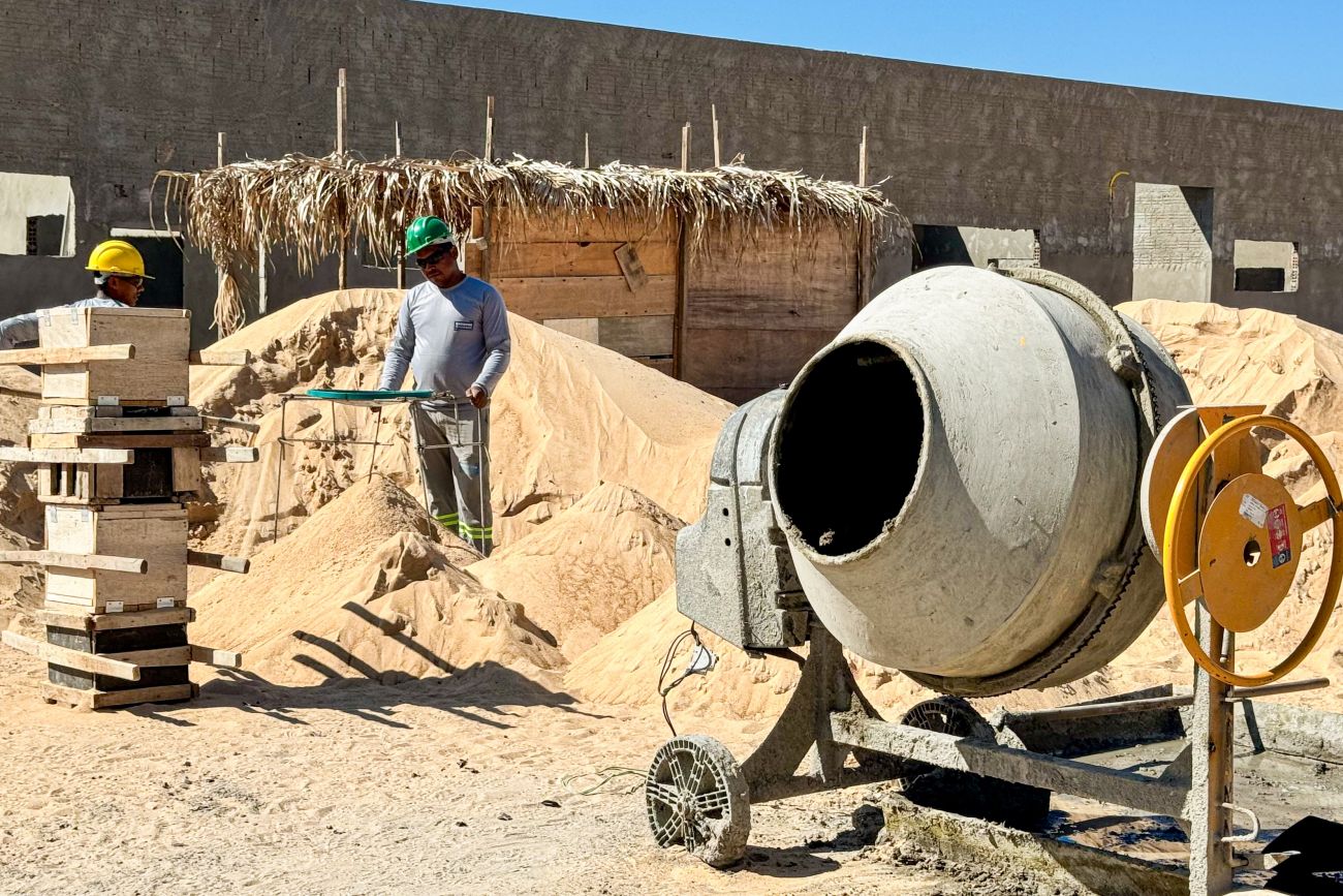 Toda a parte estrutural do concreto já foi finalizada. Está em execução a colocação de telhado, o reboco das paredes internas e externas, aplicação de piso de alvenaria, os sistemas de drenagem pluvial e esgotamento.