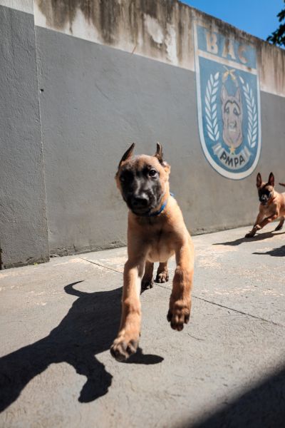 PREPARAÇÃO – Desde os primeiros dias de vida, os nove filhotes da raça pastor-belga-malinois são estimulados pelos adestradores policiais. O trabalho de preparação inicial com os cães inclui estímulos sonoros, sensoriais e olfativos, além da promoção de ambientação, socialização e manejo com técnicas específicas de movimentação de cabeça e tronco.