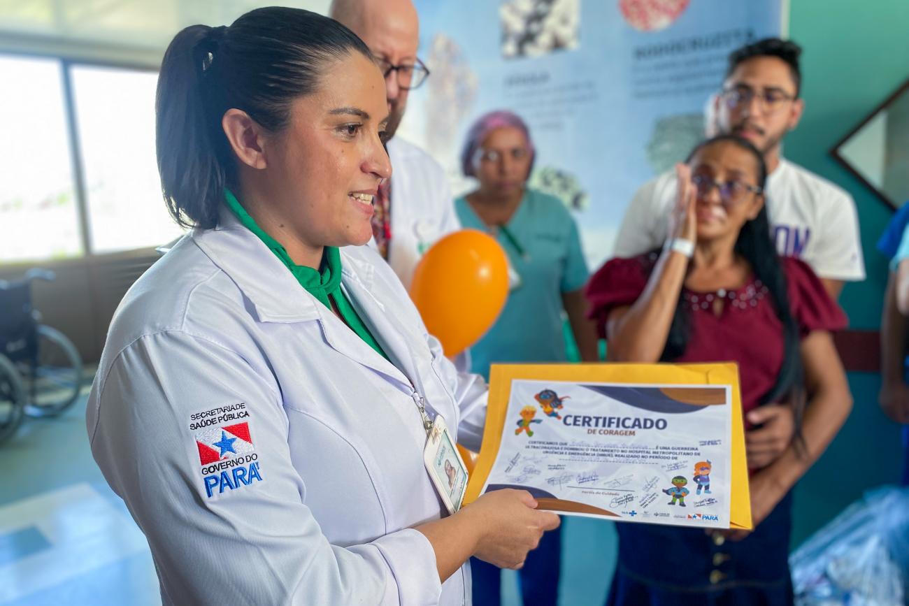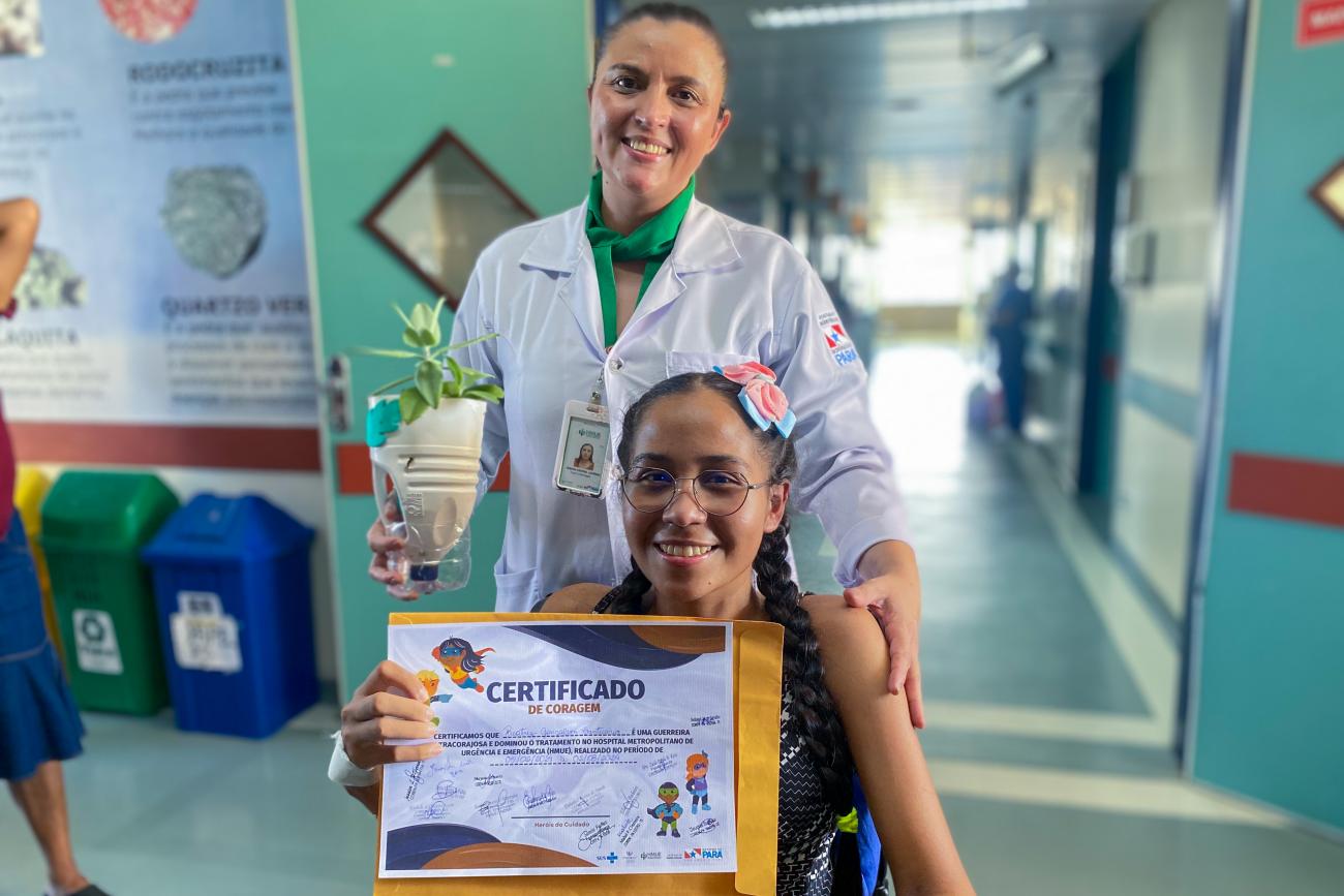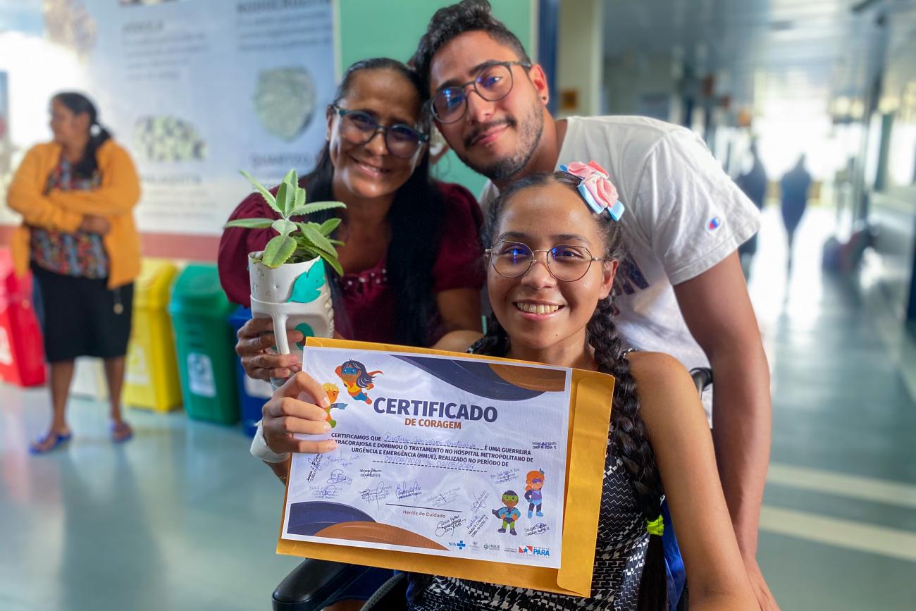 Diversos profissionais de saúde do Hospital Metropolitano de Urgência (HMUE), unidade referência para tratamento de traumas complexos em Ananindeua, na Região Metropolitana de Belém, se reuniram para celebrar a alta da jovem Beatriz Gonçalves, de 23 anos, internada há dois meses, após ser vítima de um grave acidente de trânsito em que foi atropelada por um caminhão.