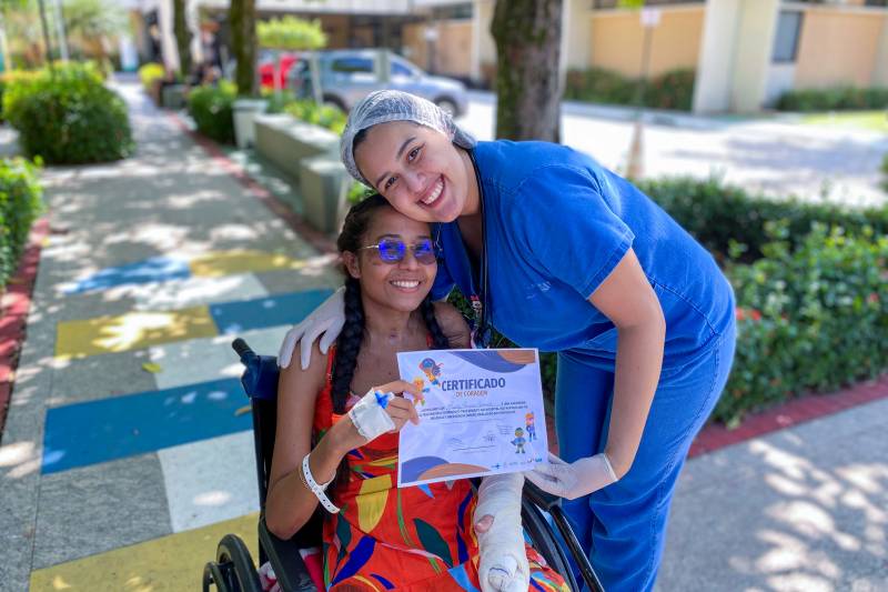 “A equipe multidisciplinar do Hospital, tanto aqui na enfermaria quanto na UTI, se dedicou incansavelmente para que a Beatriz vivenciasse esse momento ao nosso lado e ao lado de seus familiares”, comenta a coordenadora de enfermagem da clínica cirúrgica do Metropolitano, Débora Lourinho.