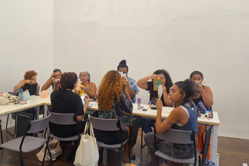 “Eu estou gostando bastante, por estar fazendo essa descoberta do outro lado de ser mulher, que tem elementos mais exagerados e extravagantes, eu já trabalho com a arte mas é a primeira vez que eu tenho contato com esse tipo de arte mais performática, e acredito que o resultado dessa oficina vai ser muito bom porque nós estamos nos empenhando muito, e estou ansiosa pra ver todo mundo com a maquiagem, o figurino e a montagem completa”.