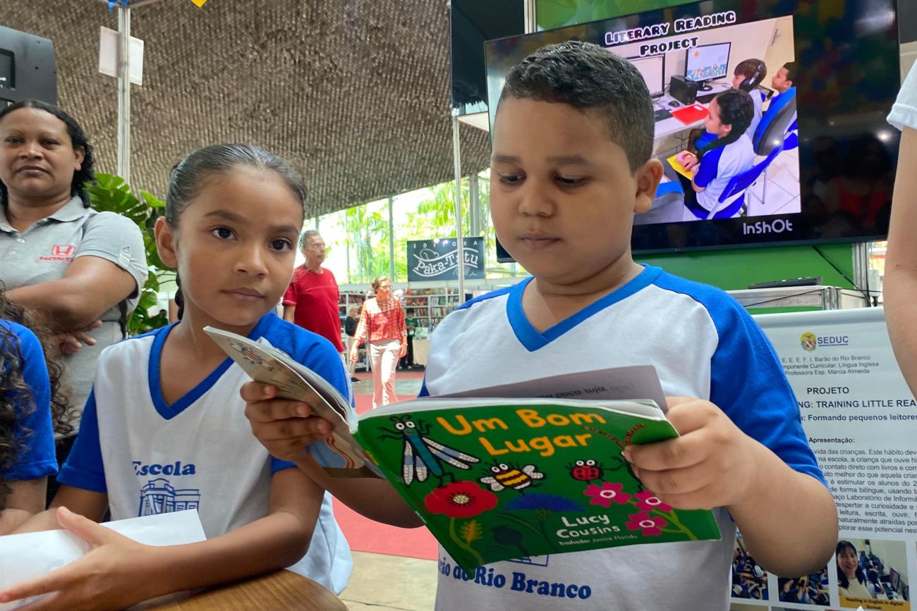 À tarde, a equipe escolar da Escola Estadual Barão do Rio Branco, em Belém, juntamente com a participação dos estudantes, apresentaram o projeto “Literary Reading: Training Little (leitura Literária: Pequenos Leitores)”. A iniciativa visa levar a literatura para a sala de aula, com leituras bilíngues, português e inglês.
