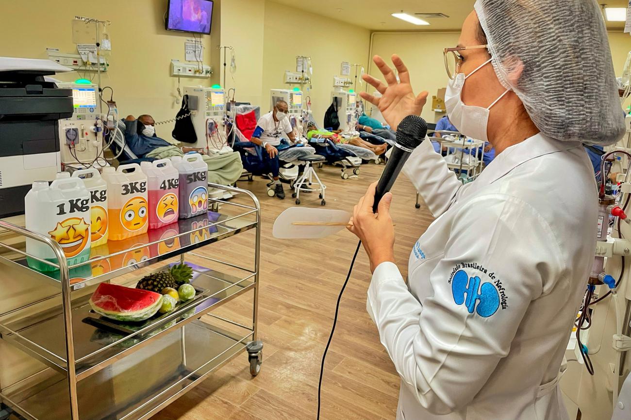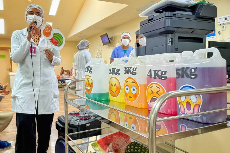 Além das palestras promovidas pela equipe multidisciplinar e médicos da unidade hospitalar, os pacientes interagem com recipientes contendo líquidos para visualizar e sentir a quantidade de líquido retido no corpo com base no ganho de peso. “Esse método também pode ser utilizado em casa, com garrafas PET ou recipientes semelhantes”, observa Elisabeth.