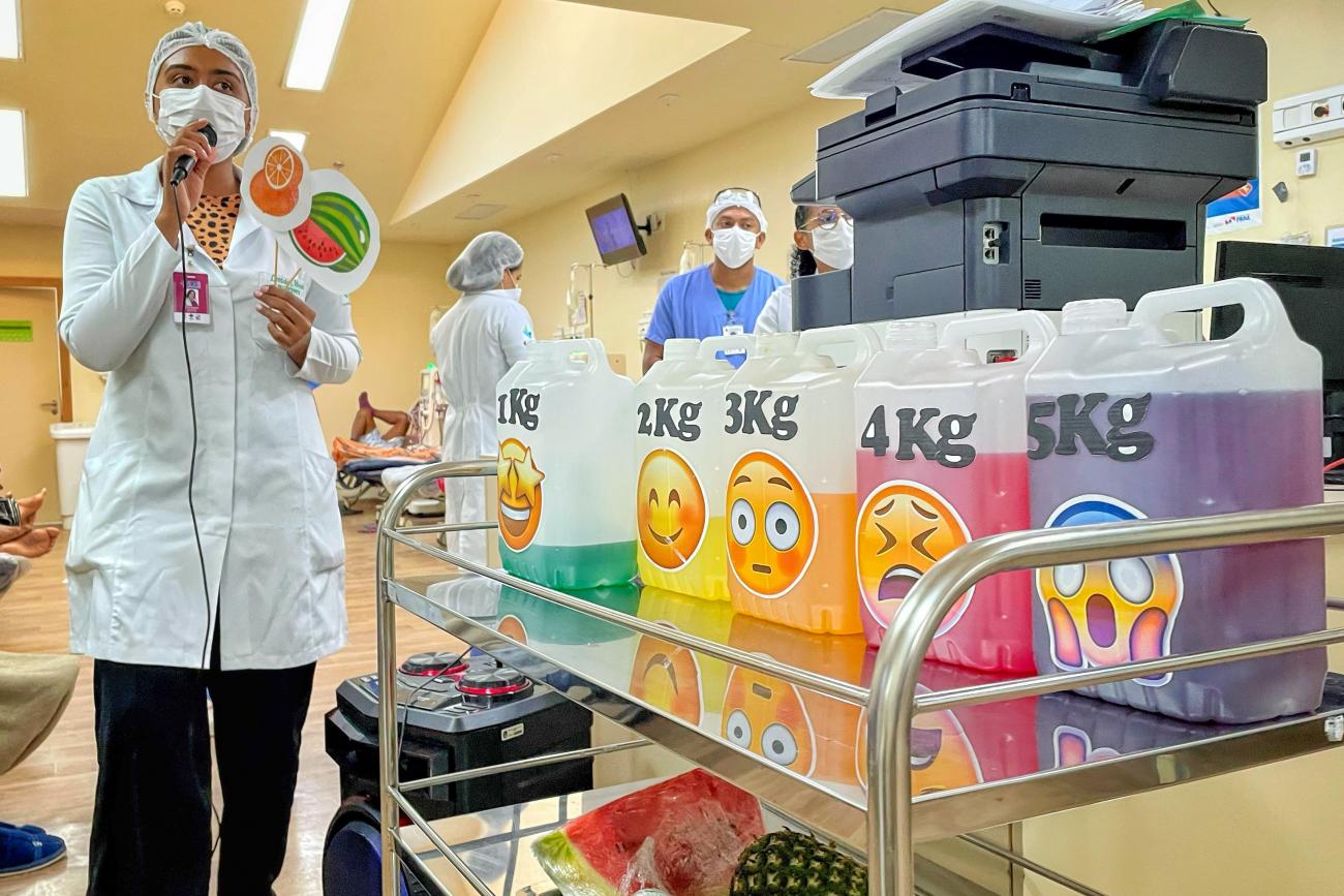 Durante as ações, a equipe multidisciplinar do HRAS utiliza garrafas com volumes específicos de líquido, variando de um litro a cinco litros, para demonstrar o peso correspondente a cada quantidade. Cores como verde (normal), amarelo, laranja (atenção), vermelho e roxo (elevado) são empregadas para indicar os riscos associados ao aumento do peso e a importância do monitoramento.