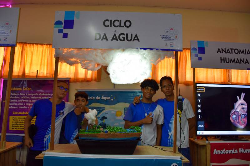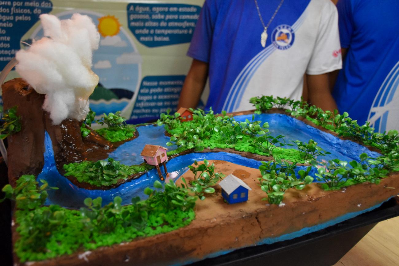 E o Ciclo da Água? Foi Para responder essa pergunta que o grupo liderado pelo estudante Anderson Cauã estudou para mostrar, através das palavras, e, também, de uma maquete, o movimento contínuo da água presente nos oceanos, nas diferentes superfícies e na atmosfera. Oportunidade que engrandece a cartela de conhecimento de alunos e visitantes.
