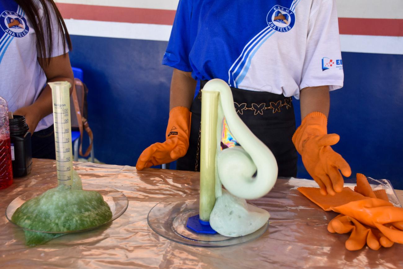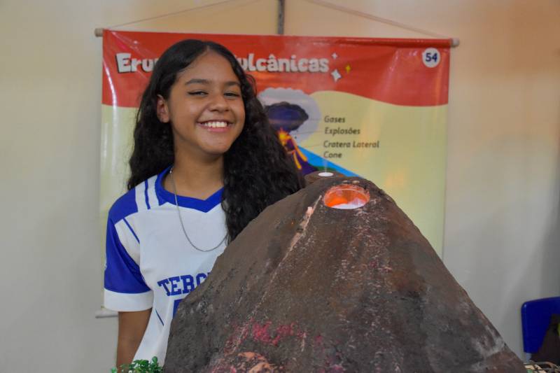 Do ciclo da água para as erupções vulcânicas as informações esquentaram. No estande de apresentação da Mikaelky Gomes e equipe, um grande vulcão foi confeccionado com materiais de papelaria para explicar o que ocorre quando um vulcão explode. “A erupção vulcânica é composta pelas placas tectônicas, e nelas têm todos os minerais e elementos químicos da tabela periódica. Quando esses elementos derretem, formam uma fumaça, que sai como um aviso de que a explosão irá acontecer”.