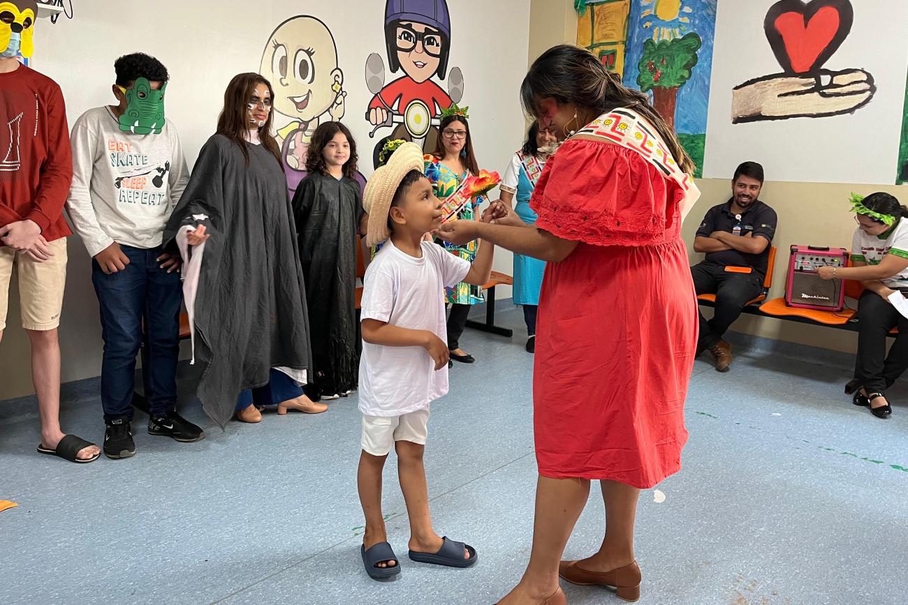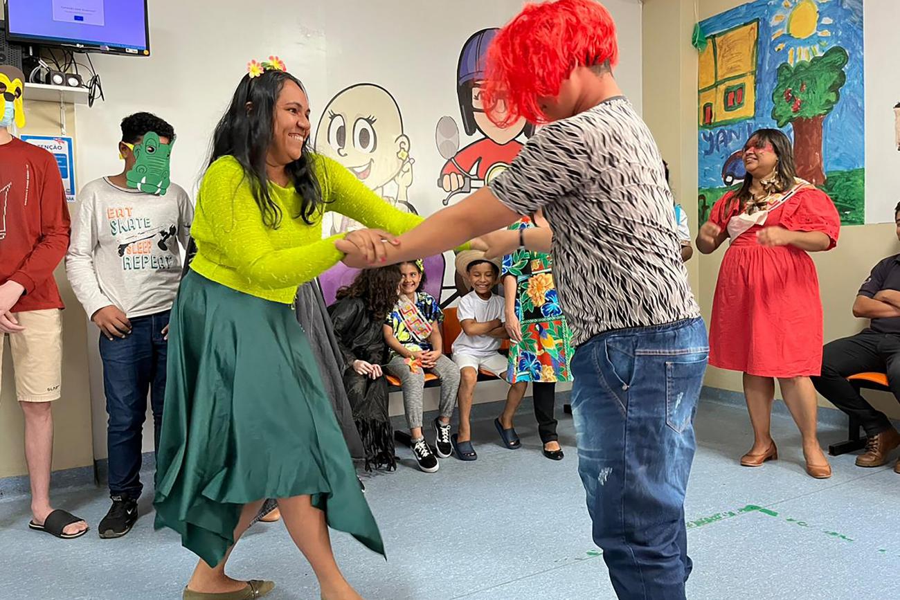 Os alunos da Classe Hospitalar Prof. Roberto França, em funcionamento no Hospital Oncológico Infantil Octávio Lobo (Hoiol), apresentaram nesta quinta-feira (22) o espetáculo “Festa na Floresta”, em alusão ao Dia do Folclore, na brinquedoteca do 5º andar. Com a participação dos professores, a narrativa infantil conta a história da curumim Zair, que ganha uma festa dos familiares para celebrar o aniversário de 10 anos por meio do universo imaginário do folclore da região. A peça integra o projeto pedagógico anual “Amazônia: povos da floresta e rios”, que este ano trabalha o tema “A Educação Hospitalar Semeando Saberes na Amazônia”.