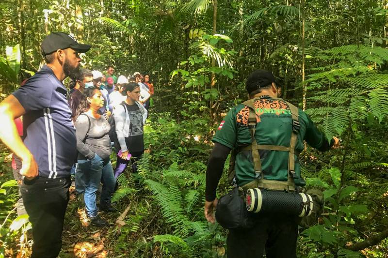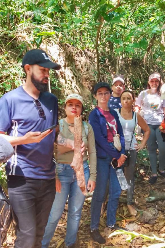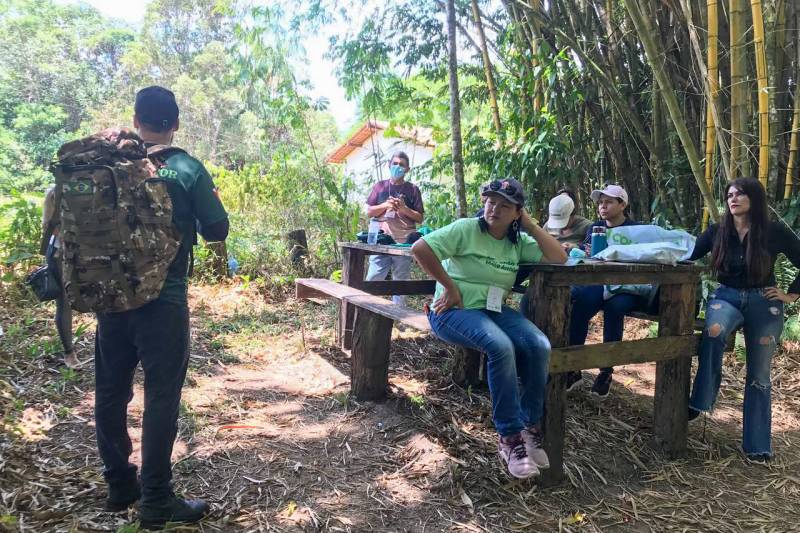 Após isso, os professores participaram de uma atividade de campo no Refúgio de Vida Silvestre Metrópole da Amazônia. É importante destacar que essa é uma das quatro UCs geridas pelo Ideflor-Bio na Grande Belém, e que além de Marituba, também perpassa os municípios de Ananindeua, Benevides e Santa Izabel do Pará. Durante a visita, os educadores percorreram trilhas ecológicas sob a orientação do condutor Willan, que destacou a biodiversidade local e as práticas de conservação adotadas no local.
