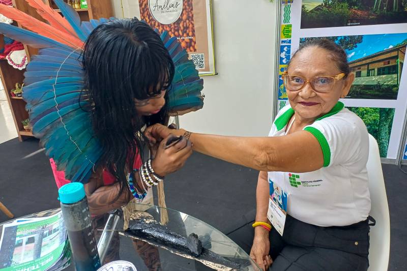 Maria Orlandina decidiu fazer uma pintura corporal"Meu avô gostava de fazer esse desenho em palha. E para ele, significava força, algo muito importante. Por isso quis fazer. Resgatei a memória dele nesse minuto". Visitando o estande do município de Belterra, durante a 12ª Feira Internacional de Turismo da Amazônia (FITA), a estudante do curso de hospedagem Maria Orlandina Parintins, 59 anos, aproveitou para fazer um grafismo indígena no braço, resgatando a memória afetiva do avô.