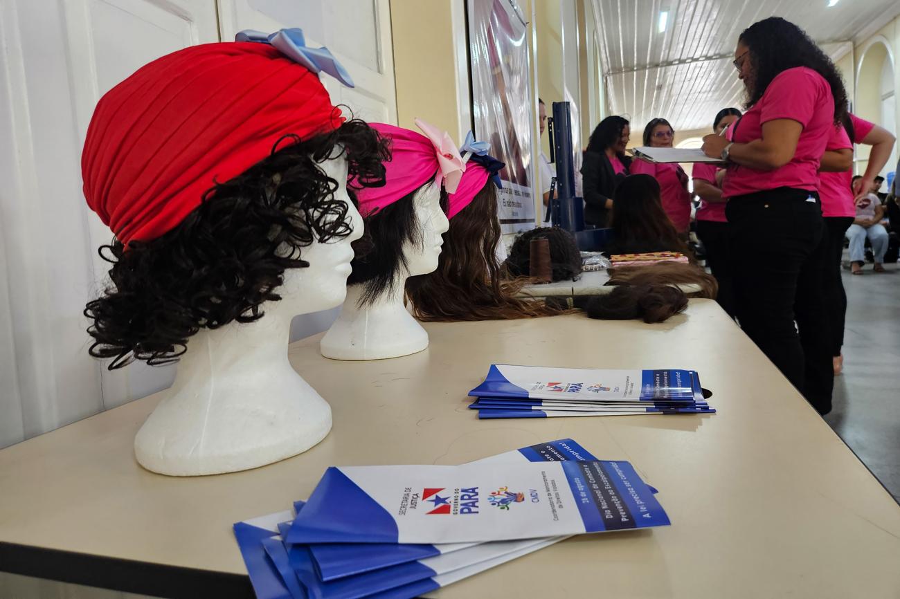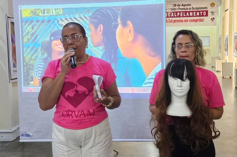 Alessandra Almeida (esquerda), da Orvam, explica sobre a doação de cabelos compridos e ajuda na confecção de perucas e próteses às vítimas