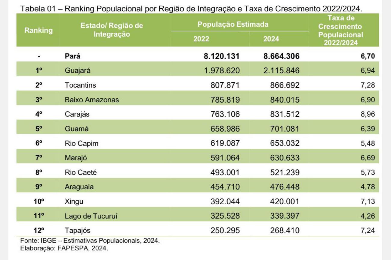As estimativas das populações residentes nos 5.570 municípios brasileiros foram divulgadas pelo IBGE, com data de referência em 1º de julho de 2024. Segundo a publicação, estima-se que o Brasil tenha 212.583.750 habitantes e uma taxa de crescimento populacional de 4,68% comparada a população divulgada no Censo 2022. A Fapespa é o órgão no Pará que organiza, interpreta disponibilizarem dados, informações e diagnósticos do estado do Pará.