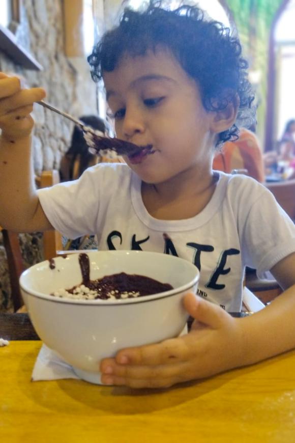Charlie Menezes, neto de Joana Menezes, ama açaíRelação de afeto e ancestralidade - A paraense Joana Menezes relata a sua relação afetiva e ancestral com o açaí. “A minha relação com o açaí é de ancestralidade. Minha avó era amassadeira de açaí, então a primeira tirada de açaí era dos netos. E não só aqui em Belém, mas na Ilha das Onças, de onde vem a família da minha mãe. Lá, era o nosso lugar de encontro e o açaí é uma referência nesses encontros, nas festas. Em qualquer atividade, era açaí com peixe”, conta.