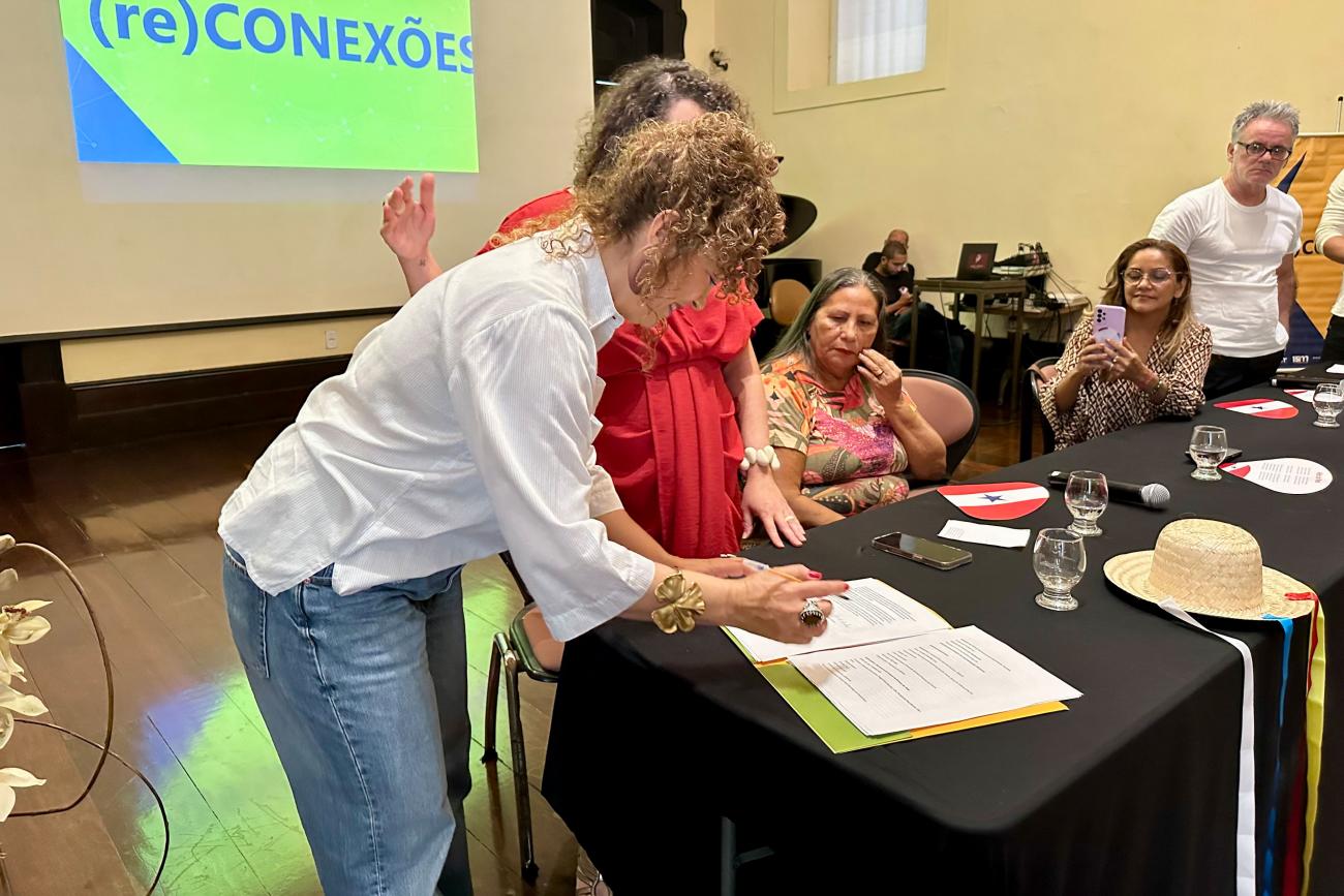 Secretária Ursula Vidal e a presidente do Ibram, Fernanda Costa, após a assinatura do Termo de CooperaçãoA Secretaria de Estado de Cultura (Secult) e o Ministério da Cultura, por meio do Instituto Brasileiro de Museus (Ibram), firmaram nesta quinta-feira (5) um Termo de Cooperação para estruturar o Sistema de Museus do Pará. O documento foi assinado pela titular da Secult, Ursula Vidal, e a presidente do Ibram, Fernanda Costa, na abertura da etapa Pará do Programa (re)CONEXÕES, promovido pelo Ibram em parceria com a Secult, no Museu do Estado do Pará (MEP), em Belém.