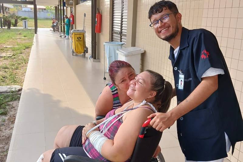 Edinelma da Silva, acompanhante Maria José Lobato e o enfermeiro Max Balieiro.Caminhar durante a internação hospitalar tem sido uma forma terapêutica para ajudar os pacientes a se recuperarem, além de ajudar a reduzir a ansiedade e melhorar a saúde e o humor dos pacientes hospitalizados. Nesse sentido, o projeto “Tour Terapêutico” do Hospital Público Regional do Marajó (HRPM), em Breves, na Região de Integração Marajó, tem como objetivo humanizar o apoio, proporcionando experiências positivas durante o possível período causador de lesões aos pacientes internados.