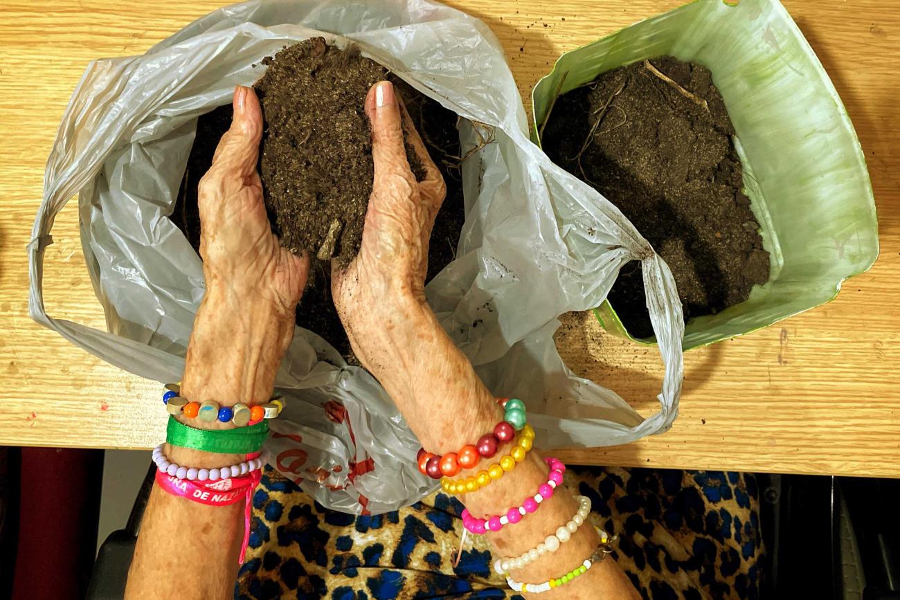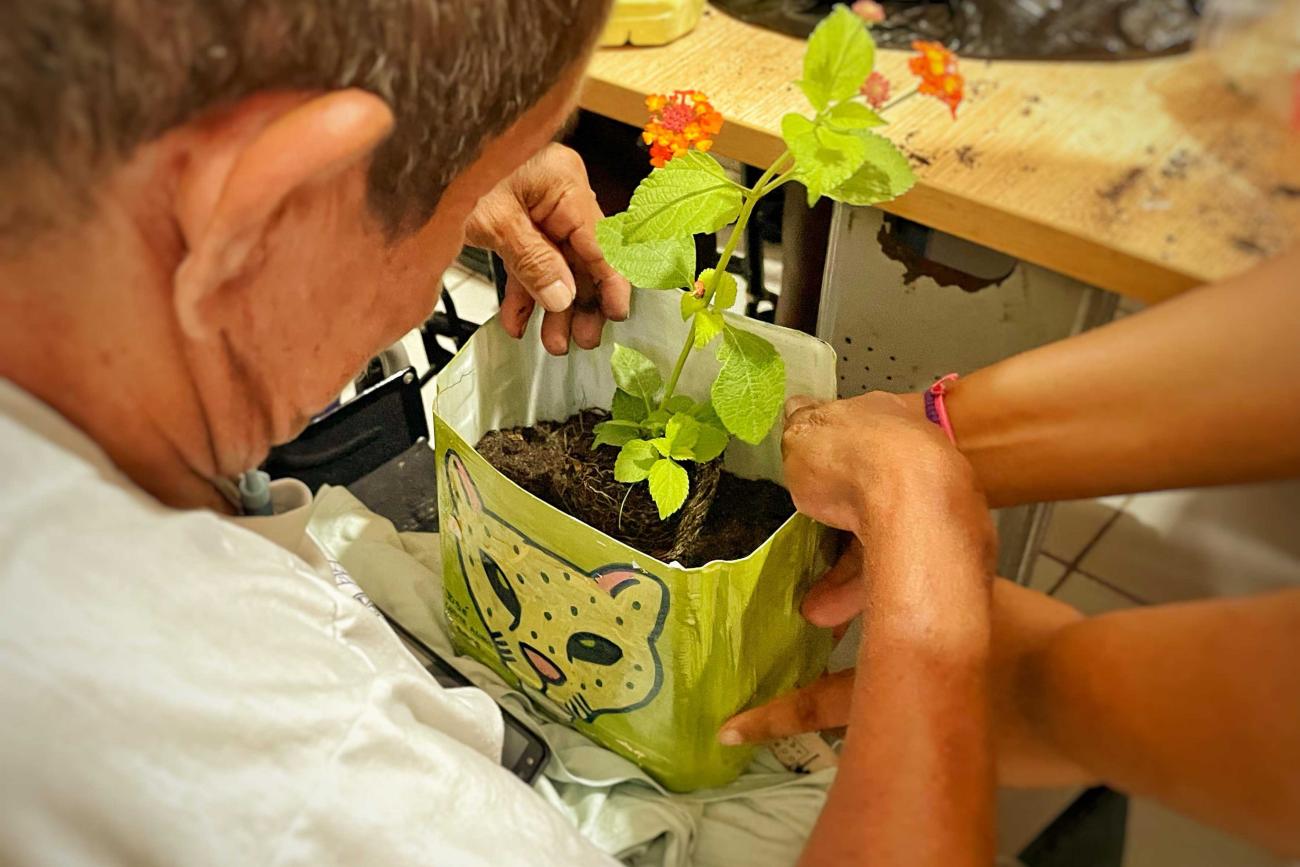 Humanização - Após o encerramento da oficina no Hospital Abelardo Santos, os vasos e plantas foram cuidadosamente preparados e entregues aos idosos. Além de ganharem os presentes, eles também participaram ativamente do processo de preparação das mudas, literalmente "colocando a mão na areia". O material integrará as atividades lúdicas promovidas pela equipe multidisciplinar do espaço de acolhimento.