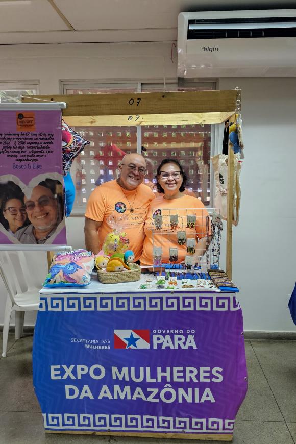 Casados desde 2016, João Bosco e Elke Lima, foram um dos casais de expositores que participaram da feira 'Expo Mulheres da Amazônia'. O casal, utiliza o artesanato como complemento da renda mensal. "Ele é o meu parceiro. Nós estamos trabalhando juntos, participamos de feiras e exposições levando os nossos produtos. Estar trabalhando com ele é gratificante demais porque temos a oportunidade de aprender um com o outro'', falou a artesã Elke Lima.