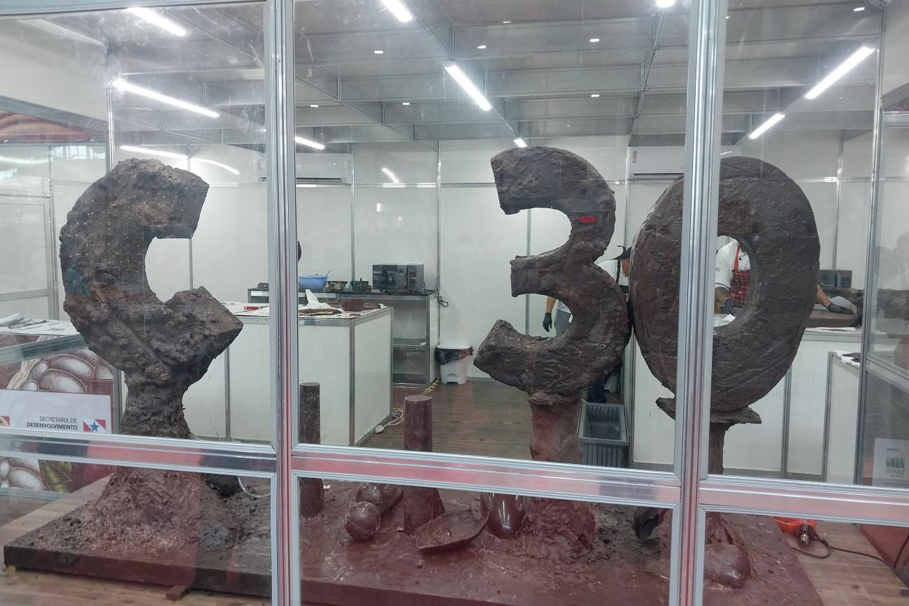 Outra atividade que tem chamado bastante atenção dos visitantes é o preparo ao vivo de uma escultura em chocolate pelos chocolatiers Leo Vilela e Tati Benazz. O trabalho, como o público já pôde conferir, é uma homenagem à COP-30, importante programação mundial que será realizada em novembro do próximo ano em Belém.