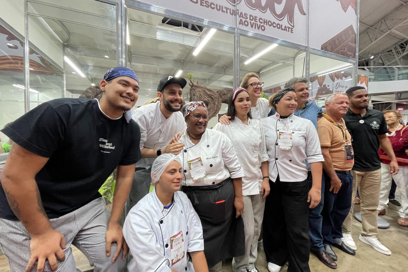 Equipe da Sedap e os chefs Tati Bennazzi e Léo Vilela (de boné), criadores da estrutura de chocolate COP 30 A chef Tati Bennazzi relatou que o pedido feito pelo governo do Estado e organizadores do evento e foi o maior já entregue. "Por conta das mudanças climáticas a gente quis trazer toda a natureza para cá e os dois principais animais que estão em extinção, a arara e a onça-pintada".
