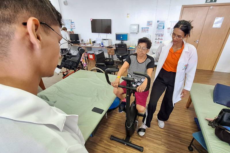 "Na reabilitação, a Maria faz treinamento aeróbico para melhorar a capacidade cardiorrespiratória, e treino de força para trabalhar o fortalecimento dos membros inferiores e superiores, pois ela vai precisar para deambular (andar) com a prótese. Em seguida, ela recebe uma prótese provisória para ir treinando em casa e no CIIR, até receber a definitiva, período em que a prótese será preparada com as medidas certas para ser utilizada de forma permanente. Então, é um trabalho de fortalecimento muscular com a educação física para a pré e pós-protetização”.