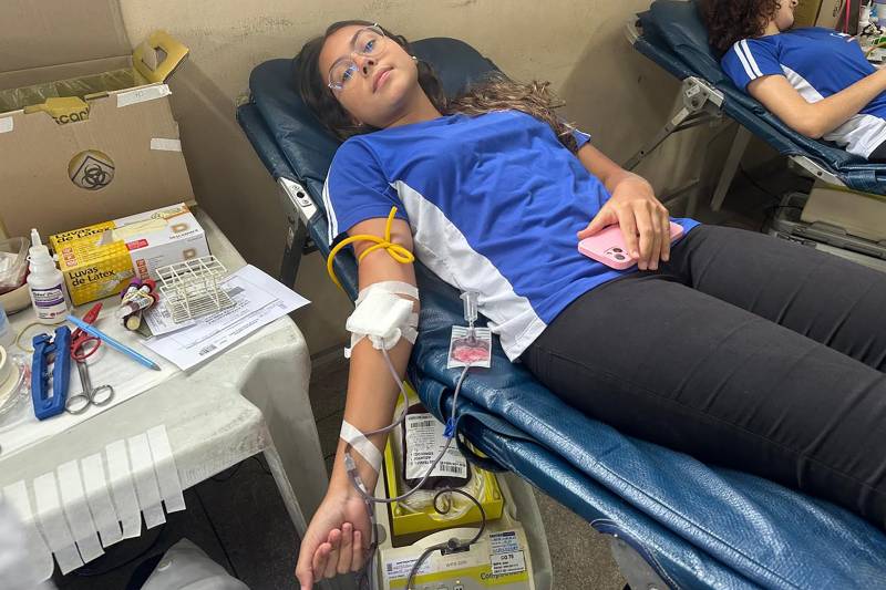 Estudante do segundo ano do ensino médio, Sofia Costa também se orgulha do gesto de doação Sofia Costa, de 16 anos, aluna do 2º ano, também doou sangue pela primeira vez e compartilhou sua experiência. "Eu estava um pouco nervosa devido à agulha, mas foi tranquilo. Achei que ia doer mais, mas foi tudo normal."