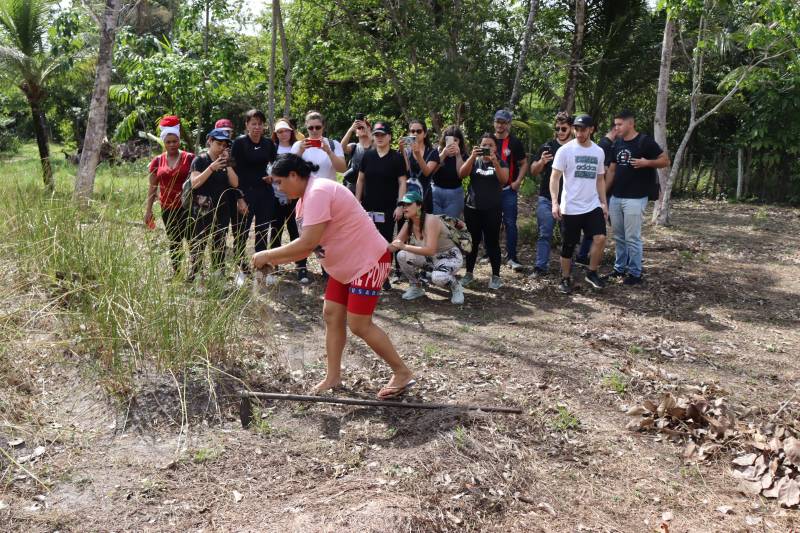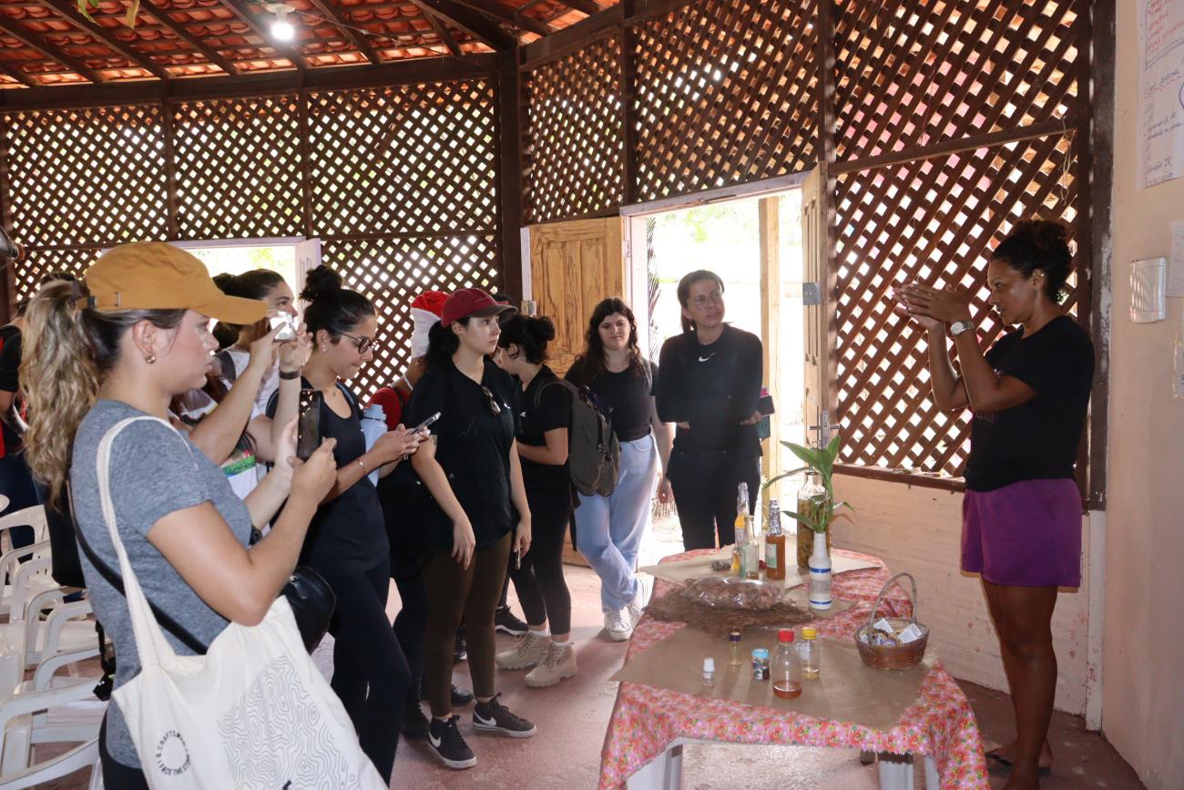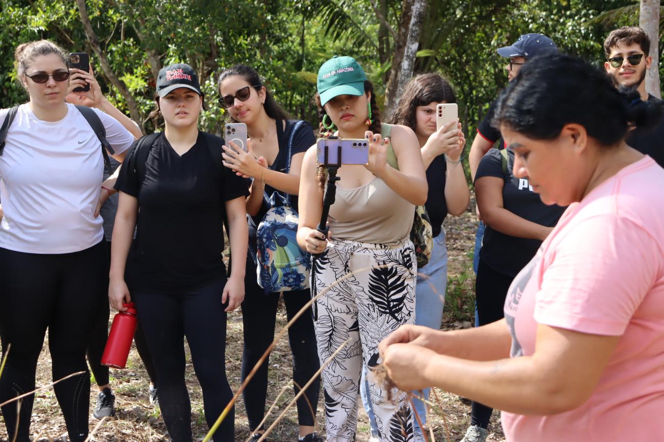 Estudantes da Escola de Saberes conversam com produtora sobre as estratégias para garantir cultivo sem molestar a florestaA ação contou com 16 alunos e do professor Danilo Caetano da disciplina "Saber local com ciência socioambiental", do Cesupa. A atividade também teve a participação da produtora cultural Márcia Conceição e de Mairna Dias, diretora de Projetos para a Sustentabilidade da Fecaf (Federação das Cooperativas da Agricultura Familiar).
