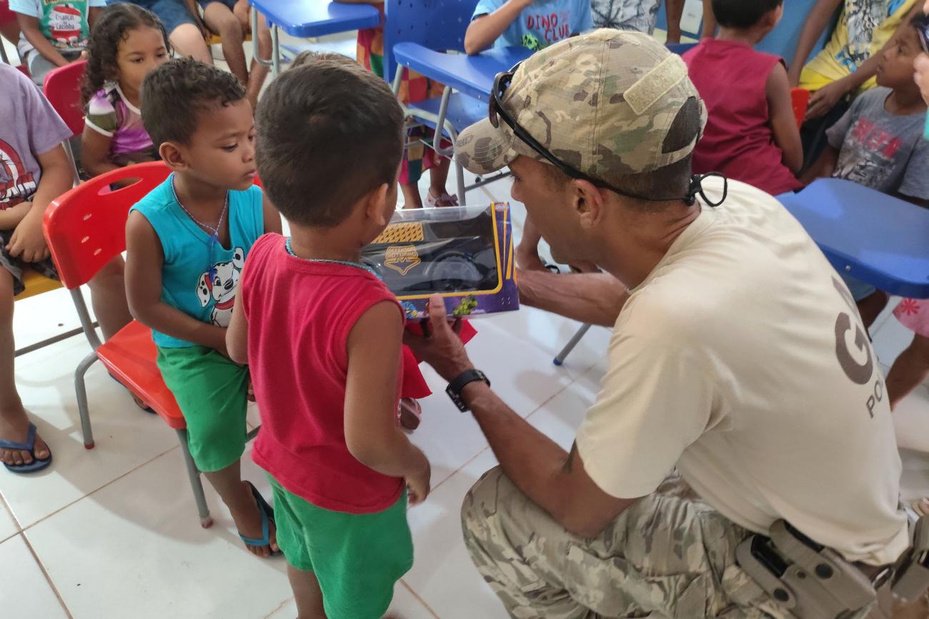 “A sensação que a gente tem é que a gente, como policial e como cidadão, a gente fazendo o bem para uma comunidade, em especial para as crianças, isso é muito fortificante para nós como pai, como cidadão, como pessoa. E ver o carinho que a gente recebe das crianças, da comunidade que aqui estão. Foi uma recepção muito boa, muito calorosa, com muito carinho. Então a gente só tem gratidão, agradecer a todos e agradecer por esse momento especial que foi feito para essas crianças aqui”, afirmou o policial penal.