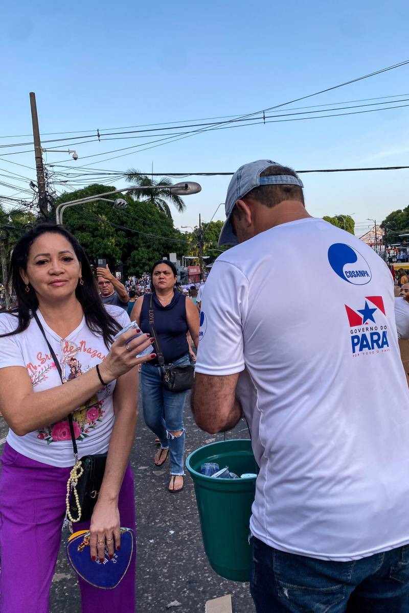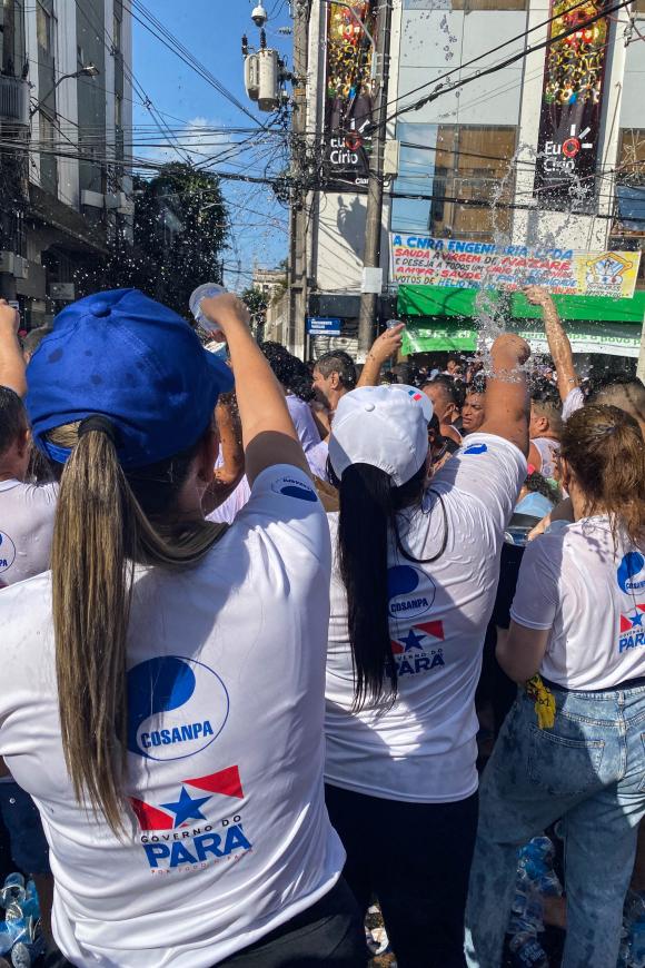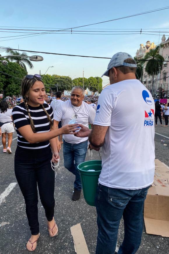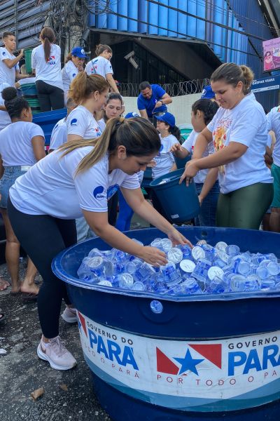 Nazaré, realizada voluntariamente por funcionários da Companhia de Saneamento do Pará (Cosanpa). Este ano, a ação contou com 115 voluntários ao todo, que se inscreveram para os dois dias de entrega. As doações foram realizadas na sexta-feira (11), durante o Traslado da imagem peregrina para Ananindeua, em que 5 mil copos foram entregues em frente ao edifício-sede da Companhia, em São Brás, Belém, e neste domingo (13), em que foram doados 45 mil copos de água.