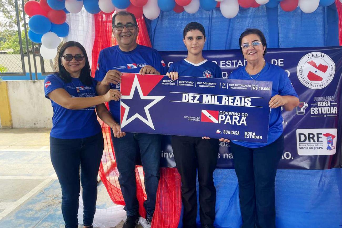 Estudantes das escolas estaduais atendidas pela Diretoria Regional de Ensino (DRE) de Monte Alegre, da Secretaria de Estado de Educação (Seduc), começaram a receber neste mês de outubro as bonificações do Programa Bora Estudar. Ao todo serão premiados 349 alunos de quatro municípios da Região do Baixo Amazonas, um investimento de mais de R$ 350 mil de incentivo e valorização da educação paraense por parte do Governo do Estado. Na manhã desta terça-feira (15), a programação de entrega dos prêmios ocorreu na quadra da Escola Estadual de Ensino Médio Pretextato da Costa Alvarenga, no município de Prainha, para 48 alunos.