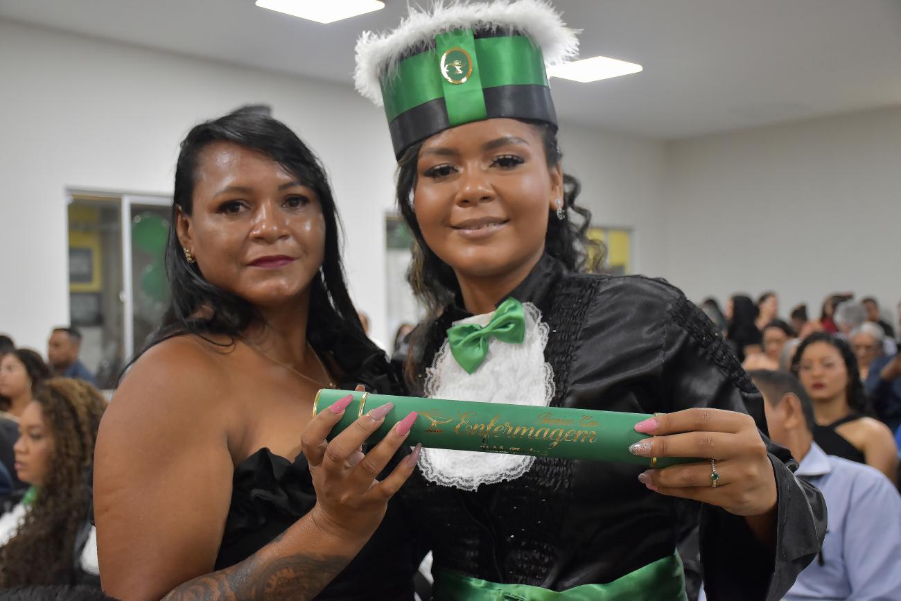 Alegria pela formatura dividida com a famíliaPara Dejenira Passinio, recém-formada, a formação abre um leque de oportunidades para o mercado de trabalho. “Concluir o curso técnico em Enfermagem através do Programa Forma Pará representa um marco muito importante na minha trajetória. Com essa formação, sei que estou preparada para enfrentar os desafios do mercado de trabalho e alcançar excelentes oportunidades na área da saúde. O programa abriu portas que antes pareciam distantes, e me proporcionou o conhecimento e a prática essenciais para construir uma carreira sólida e gratificante”, garantiu.