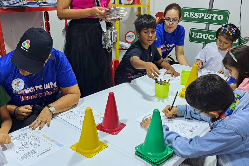 Na sala de cinema instalada na carreta da PRF, as crianças, pais e responsáveis assistiram a um vídeo educativo sobre as principais causas de sinistros de trânsito. Em seguida, os participantes foram para a carreta do Detran, onde os educadores do órgão promovem atividades lúdicas de pintura, jogos educativos e desenhos com a temática do trânsito.