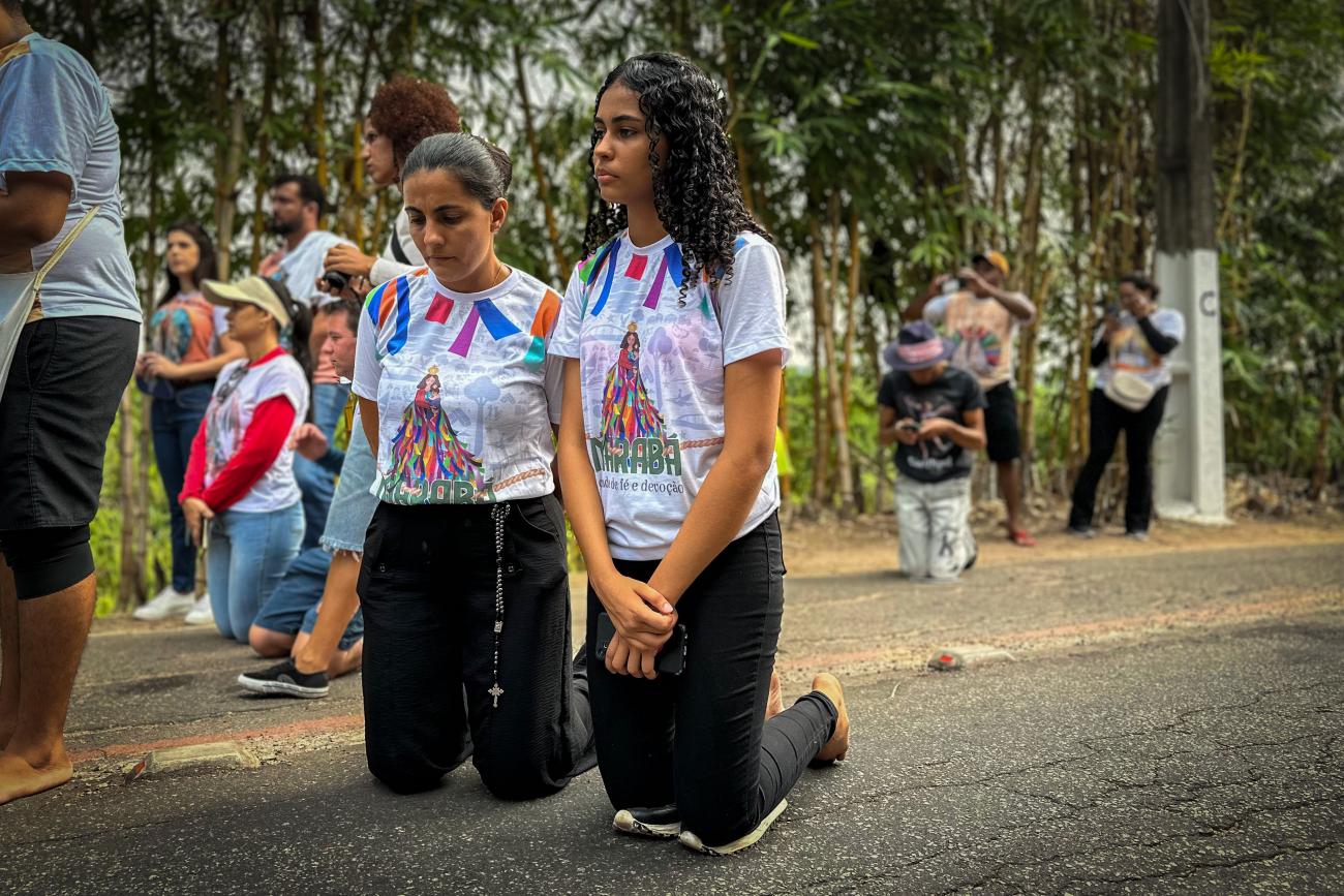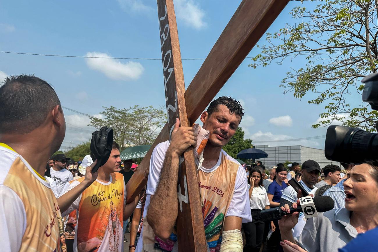 Romeiros - Entre os promesseiros, o gerente de vendas, Weliton Almeida, andou os 7,5 km com uma cruz, que pesa aproximadamente 90 kg. “Estou pagando promessa pela vida do meu irmão, que há 7 anos sofreu um acidente , ficou três meses em coma, foi desenganado pelos médicos, e Nossa Senhora de Nazaré fez um milagre na vida dele, e hoje ele está sem sequela alguma. A cruz representa gratidão”, contou ele.